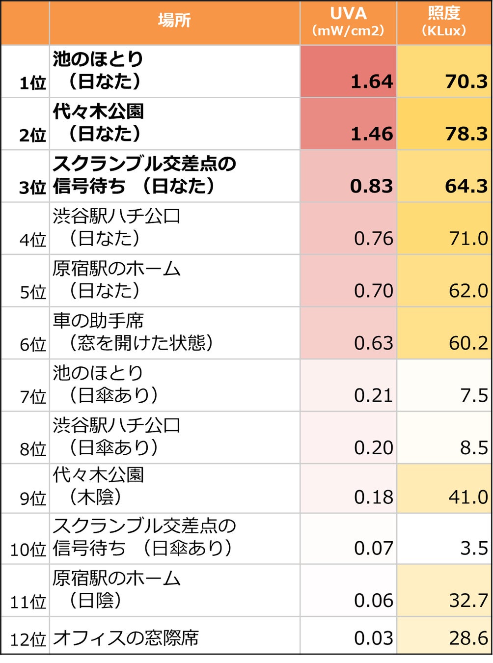 今回の検証実験では、池のほとり(日なた)> 代々木公園(日なた)> スクランブル交差点の信号待ち(日なた)の順に、UVAが強いという結果が出ました。天候の変化や陰による各数値の変化に着目すると、UVAの減少率は照度の減少率に比べるとあまり大きくないことがわかります。目に見える明るさとリンクしていないため、油断するとうっかりUVAを浴びてしまう可能性が高くなります。