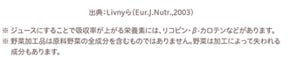 生野菜と比べると加工した野菜は栄養成分が減少してしまうというイメージが強いですが、β-カロテン成分は野菜ジュースにすることで逆に吸収率が高まる栄養素であることがわかっています。