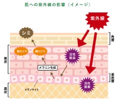紫外線を浴びると、肌の中で活性酸素が発生します。この活性酸素の刺激を受けることで、肌の奥にあるメラノサイトという細胞が、シミの原因となるメラニンをつくります。この肌の奥に潜むメラニンこそが隠れジミと呼ばれ、いずれ肌の表面に現れるとシミになる可能性があるのです。