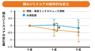 続けたグループの隠れジミスコアを比較。その結果、野菜・果実ミックスジュースを飲んだグループは水を飲んだグループに比べて、1カ月で隠れジミスコアが改善しました。また、血中のβ-カロテン濃度が高い人ほど隠れジミスコアが改善する傾向もみられました。