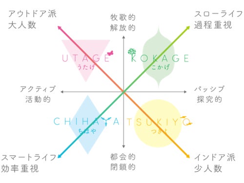 新しいMasterPieceはお客様のライフスタイルを「行動様式」と「思考様式」の2つの軸で4つに分類し、それぞれのライフスタイルに合わせた住まいのモデルプラン「うたげ」「こかげ」「つきよ」「ちはや」をご用意しました。