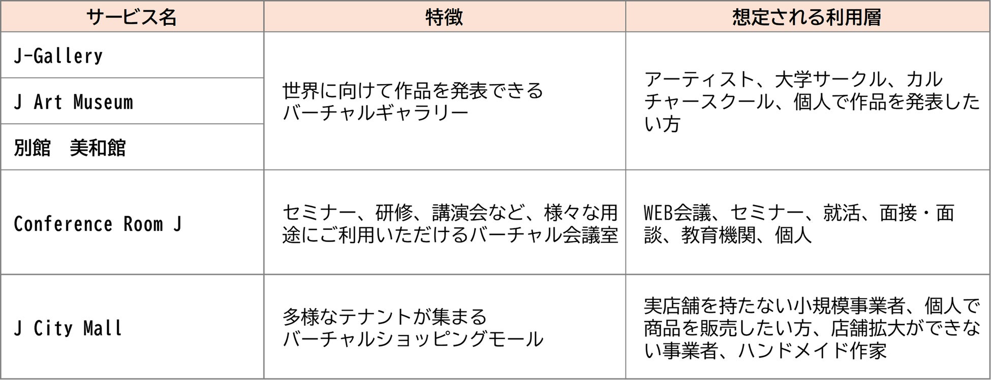 J-Gallery・J Art Museum・別館 美和館・Conference Room J・J City Mallの5つのサービスを提供するバーチャル空間レンタルプラットフォームです。