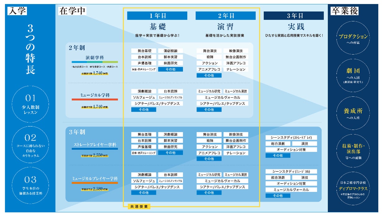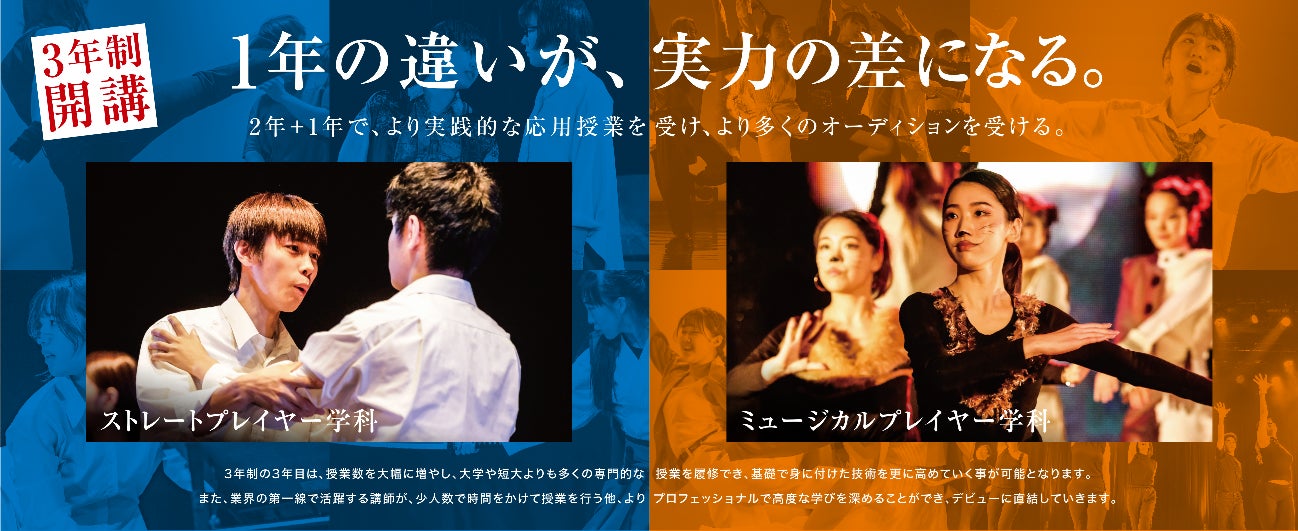 新たに新設されたストレートプレイヤー学科・ミュージカルプレイヤー学科では3年制の最大の特徴を最大限活かし、 授業数を大幅に増やし、大学や短大よりも多くの専門的な授業を履修でき、基礎で身に付けた技術を更に高めていく事が可能となります。