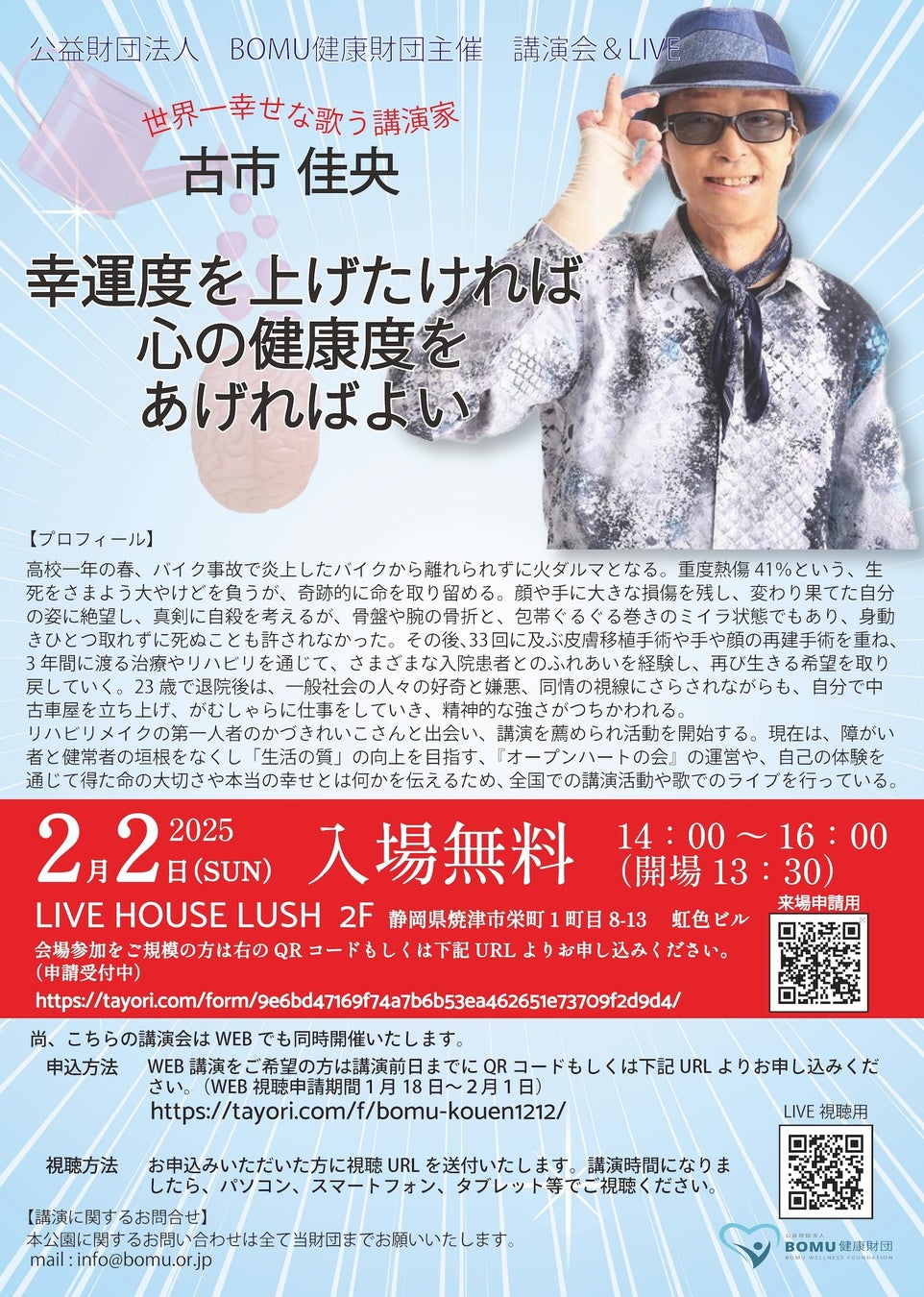観覧無料!公益財団法人BOMU健康財団主催「古市佳央講演会&LIVE」。2025年2月2日(日)。静岡県焼津市にて開催。
