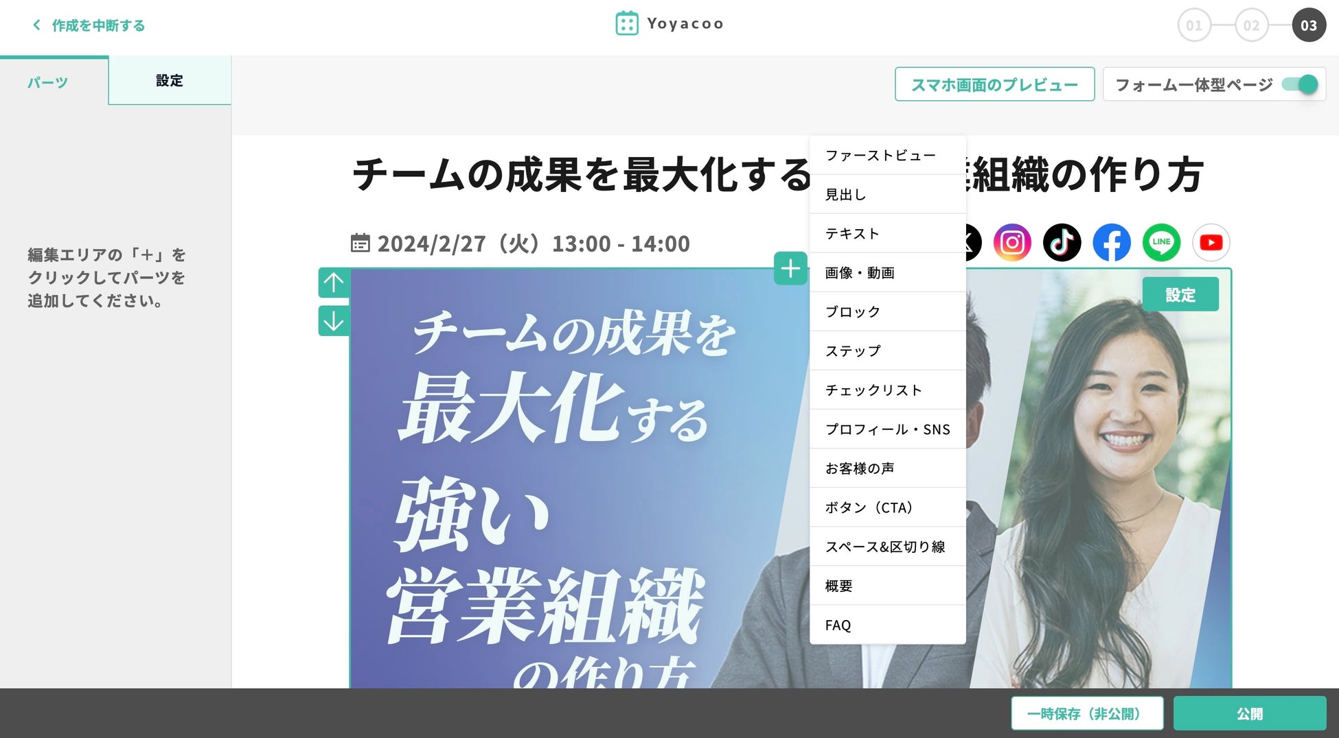 ヨヤクーの最大の特徴は7つのカテゴリーのフォーム付きLP(ランディングページ)をノーコードで簡単に作成できることです。
