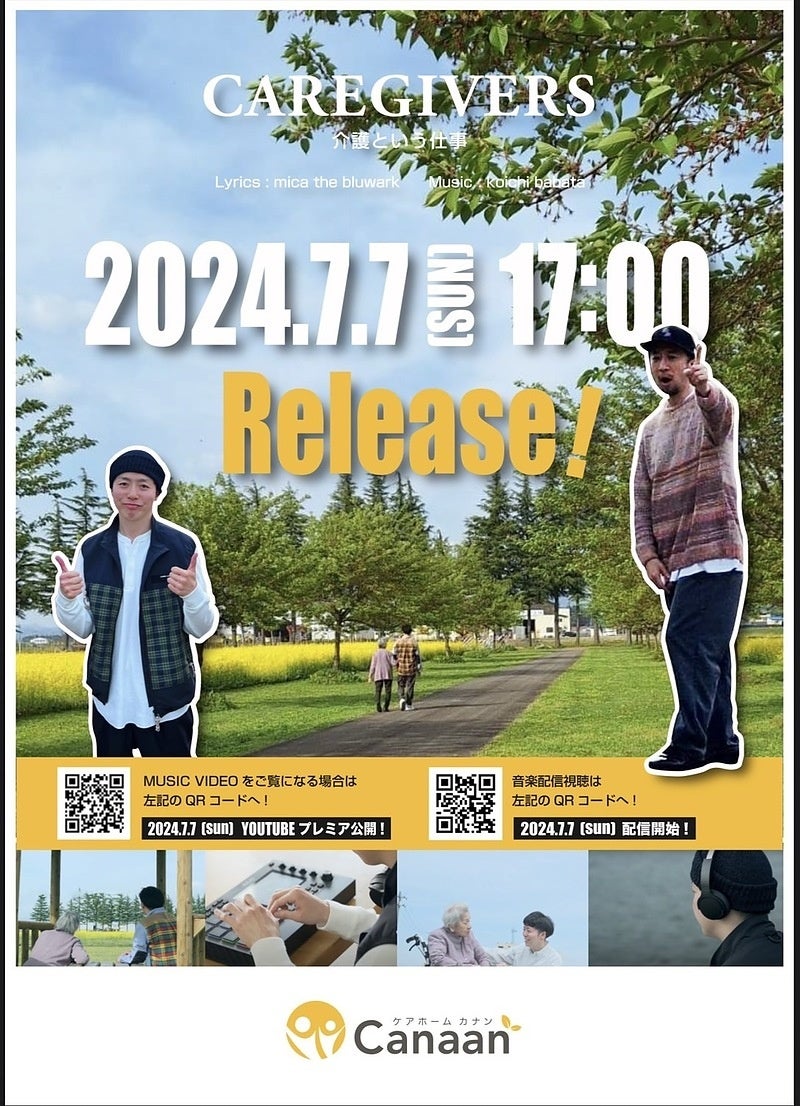 この作品は、ケアホームカナン施設長でありながらDJとして音楽活動(ビートメーカー)をしている馬場田晃一と、宮城県仙台市で活動するラッパーの「mica the bulwark」とのコラボレーションで制作されました。 介護職の方々への取材を通じて、介護の現場で働く方々の声を紡ぎ1年をかけて製作してまいりました。 また、ラッパーの視点から見た介護の仕事の世界観も、この作品の魅力のひとつです。 現場の思いをラップとビートに乗せて、介護の魅力ややりがいを表現した素晴らしい作品に仕上がりました。 この曲は、介護に携わる方々だけでなく、多くの方に聴いていただき、業界のイメージを変える一助となることを目指しています。 そして私たちは、介護の仕事の魅力を広く発信し続けていきます。