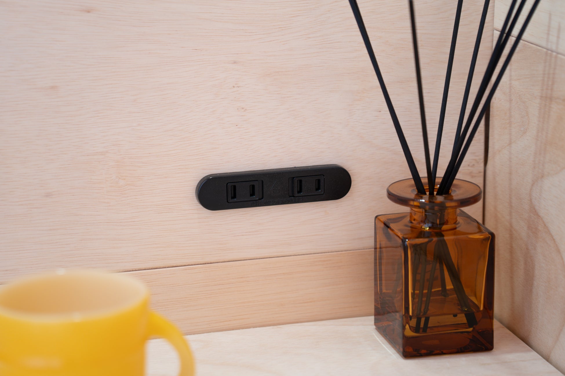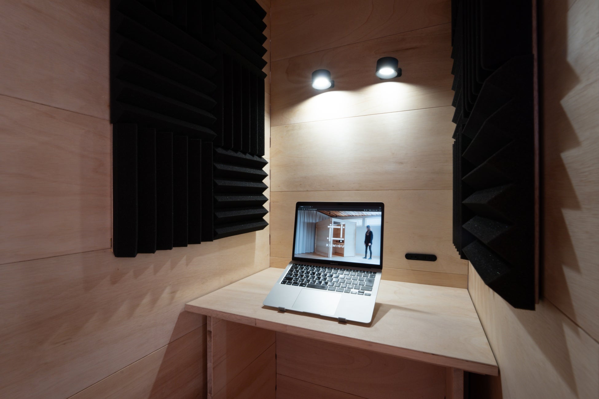 本体が木の板であるため、任意の位置に欲しいアイテムを取り付けることができます。市販の照明器具や吸音材などを組み合わせることでオリジナル空間に仕上げるのもKUMIGUならではの楽しみ方です。