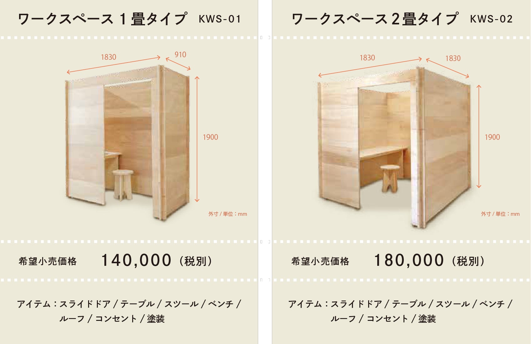 KUMIGUのワークスペースは、1畳タイプと2畳タイプの2種類を用意。お部屋の広さや用途に合わせてお選びいただけます。