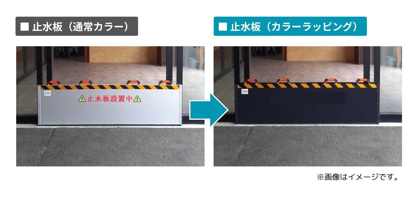 建物などに止水板を設置した際に、止水板が、建物の外観などの設置環境によりなじむよう “止水板自体” をお客様のご要望に応じた “カラーフィルムでラッピング” するサービスです。