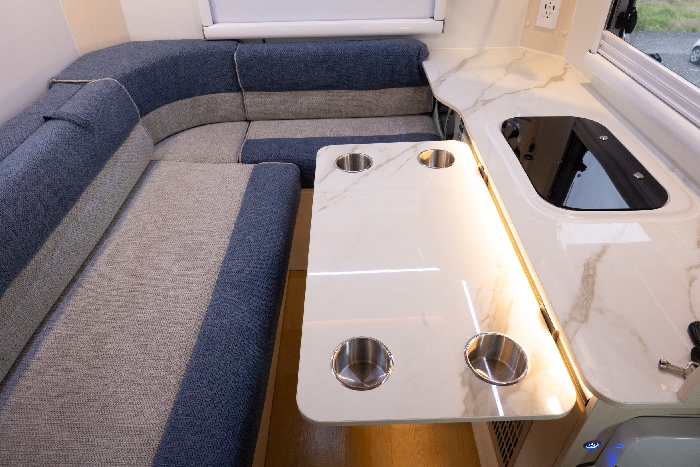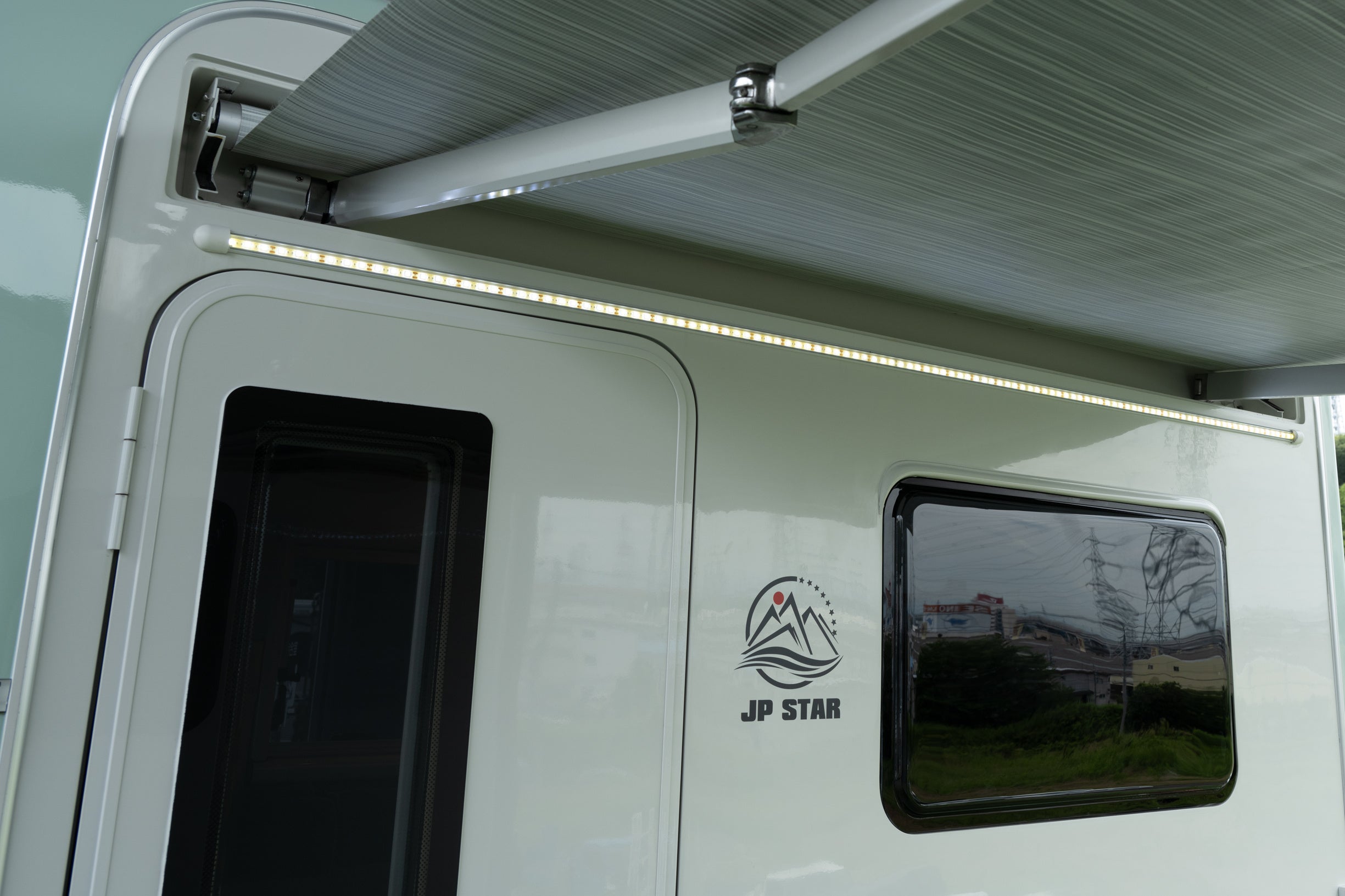 外装では、電動オーニング(標準)を車体に組み込み、よりスタイリッシュになりました。また、新採用のエントランスドアは、防音・断熱性能がアップ。シェルの接合部には金属モールディングを採用し、メンテナンス性を向上しつつ、スタイリッシュに仕上げました。