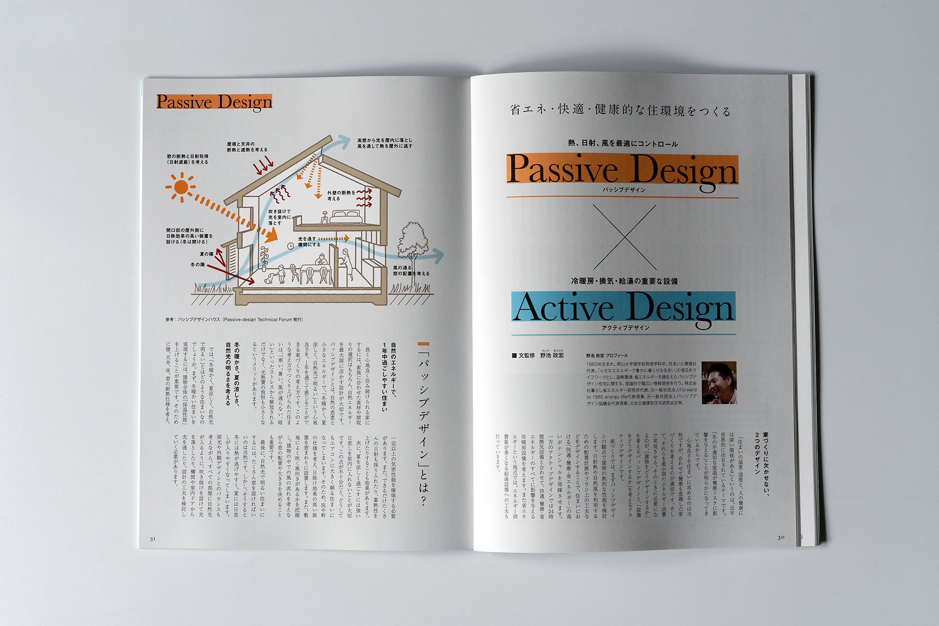 自然エネルギーを最大限に活用したパッシブデザインと、最新の技術や設備を用いて環境性能を高めるアクティブデザインの二つのデザインアプローチについて解説しています。住宅環境ジャーナリストであり、住まいと環境についての著作も多い野池政宏氏監修のもと、イラストを交えてわかりやすく解説しています。