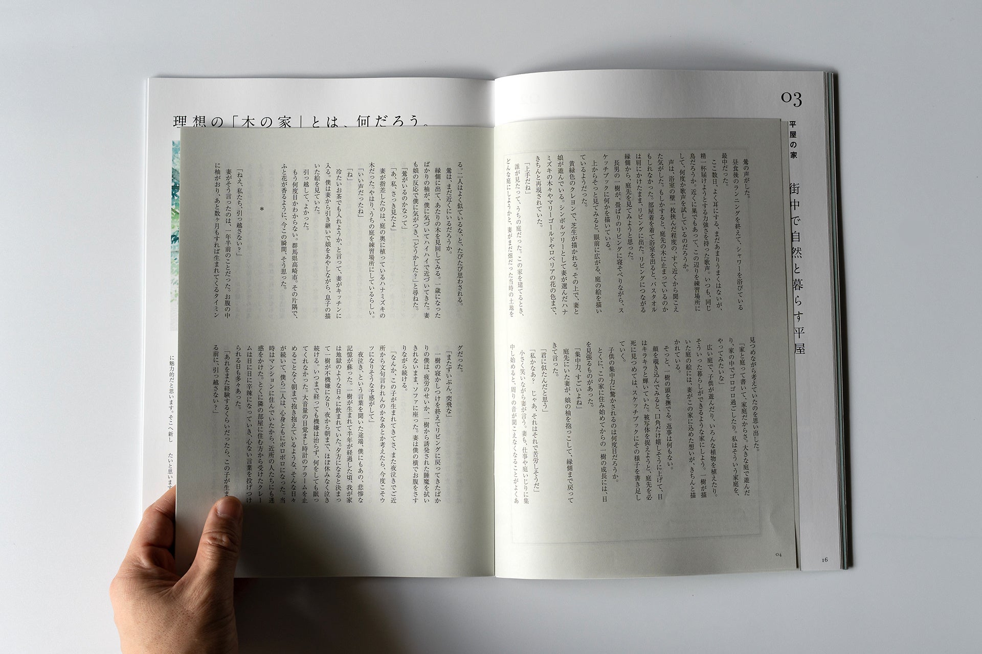 挟み込まれている別冊「人と、暮らしと、家」では、新会社案内の「事例紹介」で登場した三つの家の暮らしと、人の物語を、小説家・カツセマサヒコ氏、演劇家・藤原佳奈氏、編集者・横田大氏が短編小説として書いています。