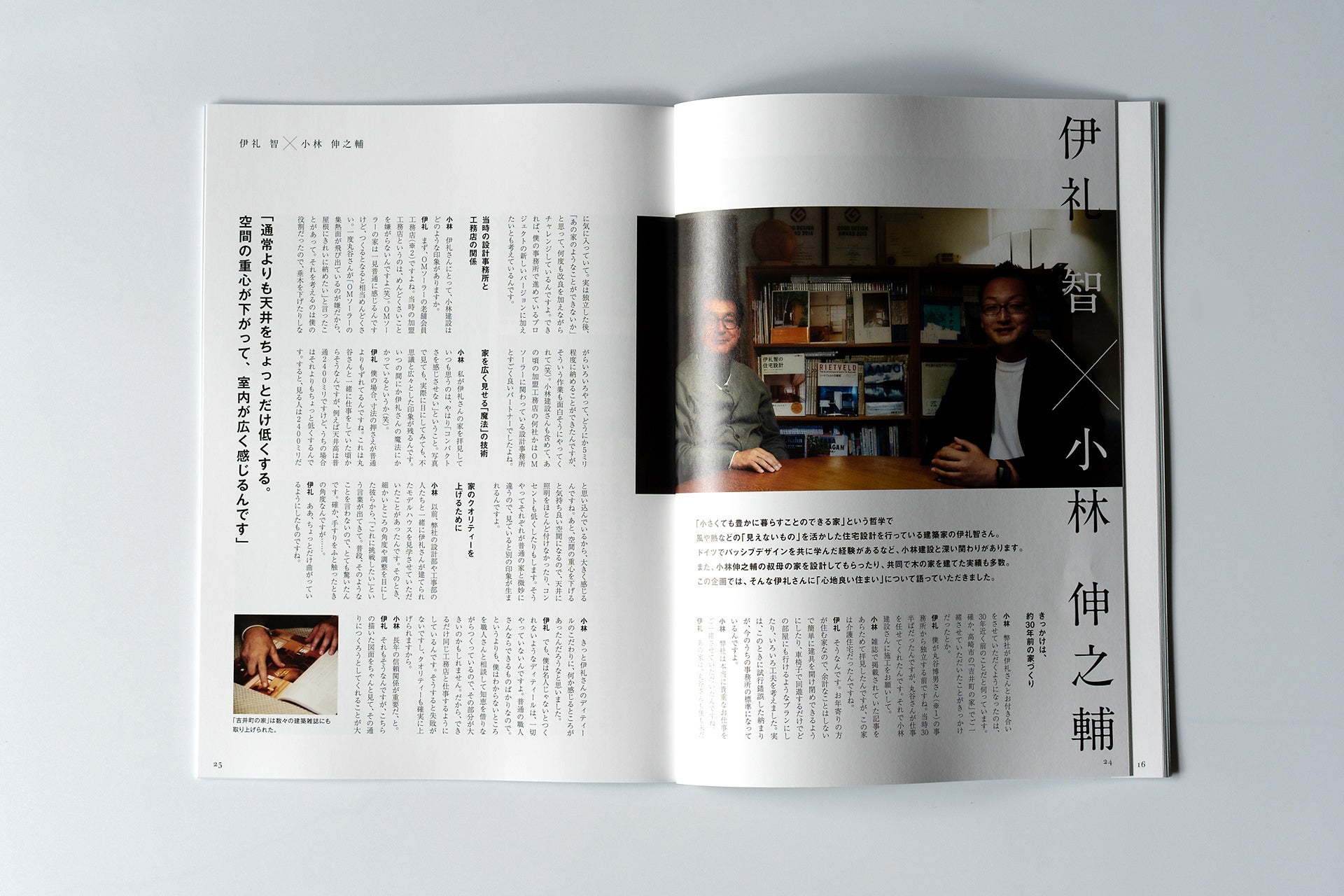伊礼智氏と小林伸之輔の対談では、小林伸之輔が設計だけでなく施工も含めた小林建設の特長のひとつである「アーキテクトビルダー」ならではの視点から、建築家の伊礼智氏との対談を掲載しています。共にパッシブデザインという共通言語をもった両者が、風や熱といった「見えないもの」を最大限に活かす、人に寄り添うことのできる「心地よい住まい」について語っていただきました。