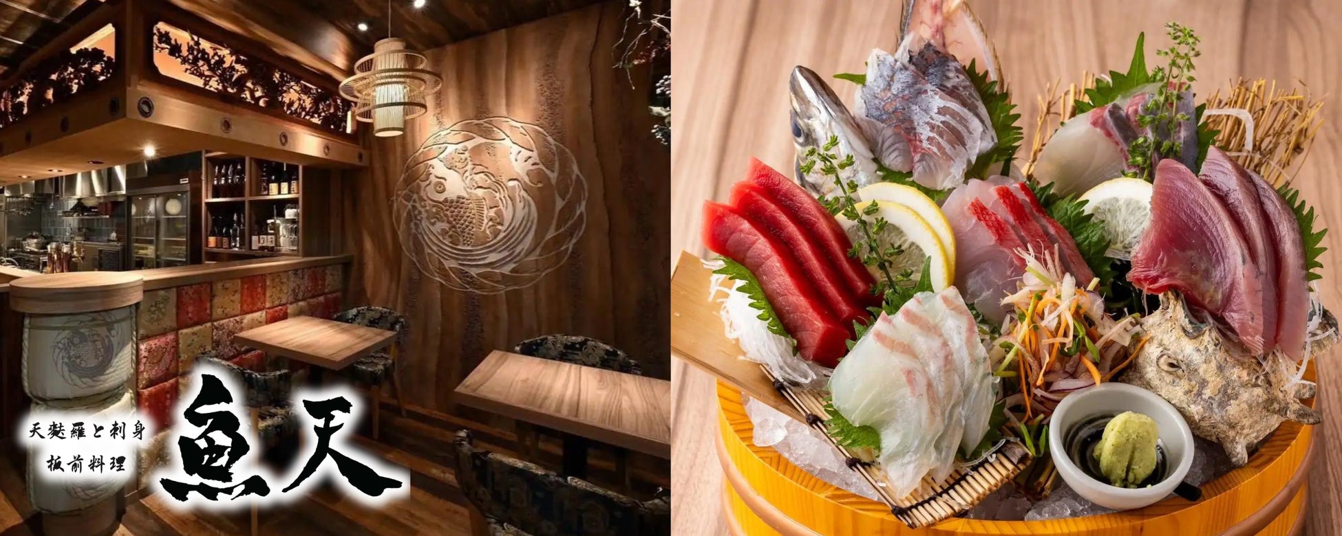 天ぷら・刺身をメインとした板前料理『魚天』 は、国産食材を80%以上使用。 東西南北、日本の四季の旬を追いかけて、素晴らしい食材をお届けします。 頑固なまでに厳選した新鮮魚介を様々な調理法でご提供させていただきます。