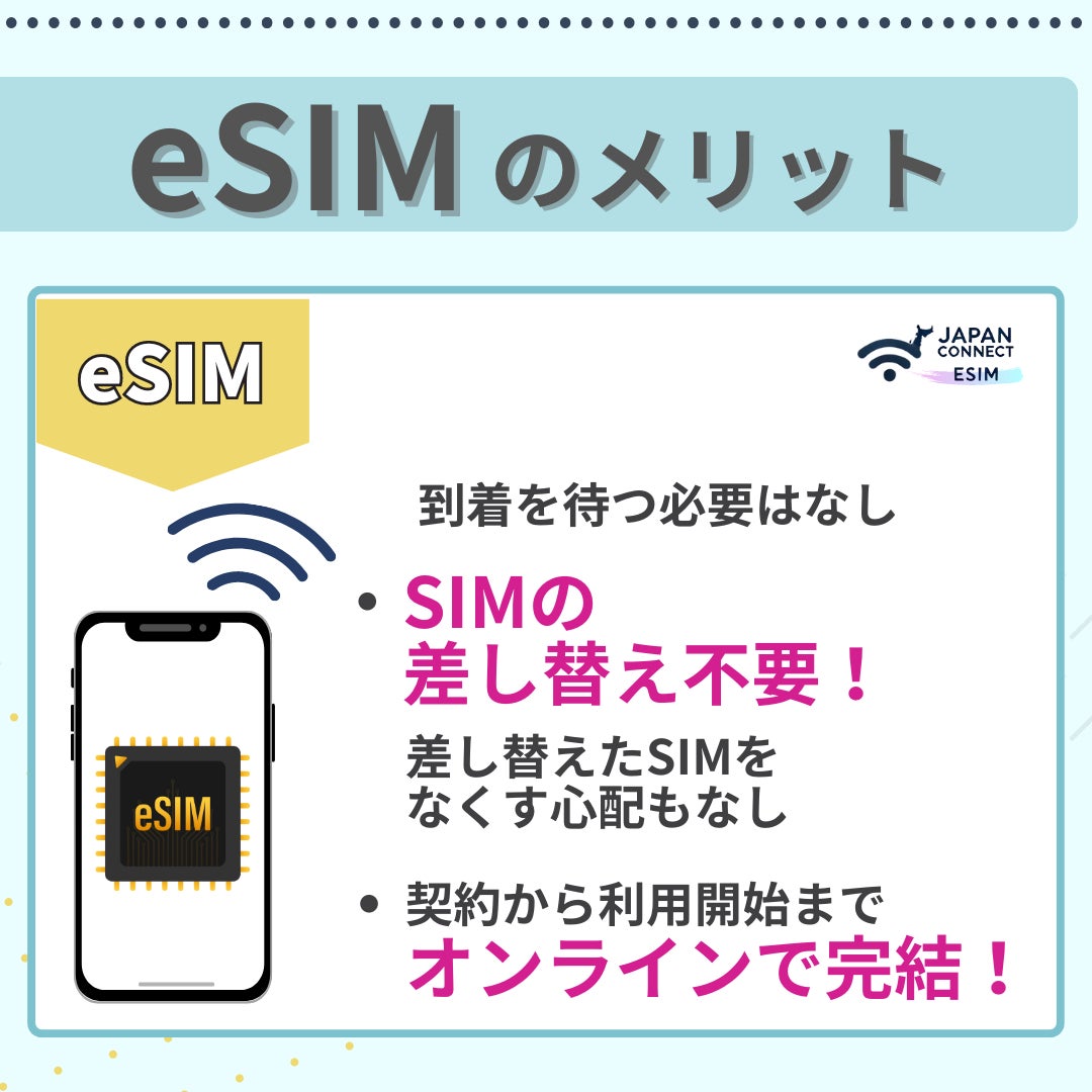 JapanConnect eSIMは、物理的なSIMカードの差し替えやモバイルルーターでの外出が不要なデジタルSIMです。