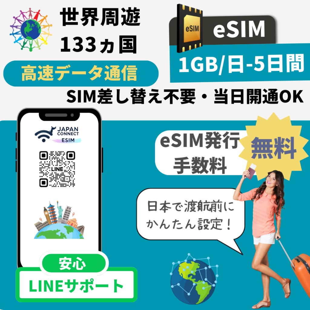 JapanConnect eSIMは世界133ヵ国で安心してインターネットが利用できます。