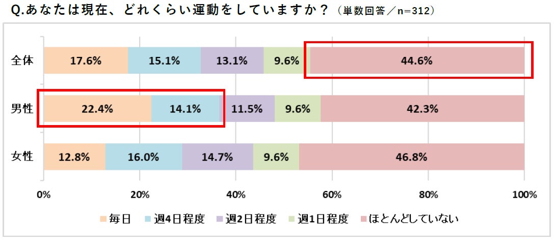 現在の運動量を尋ねたところ、「ほとんどしていない(44.6%)」が最も多い回答となり、約半数の方が日常的に運動をしていないことが明らかになりました。男性のみで見ると、週4日以上運動している人が36.5%もおり、「ほとんどしていない(42,3%)」と僅差であることから、運動をしている人としていない人が両極端に分かれていることが分かります。
