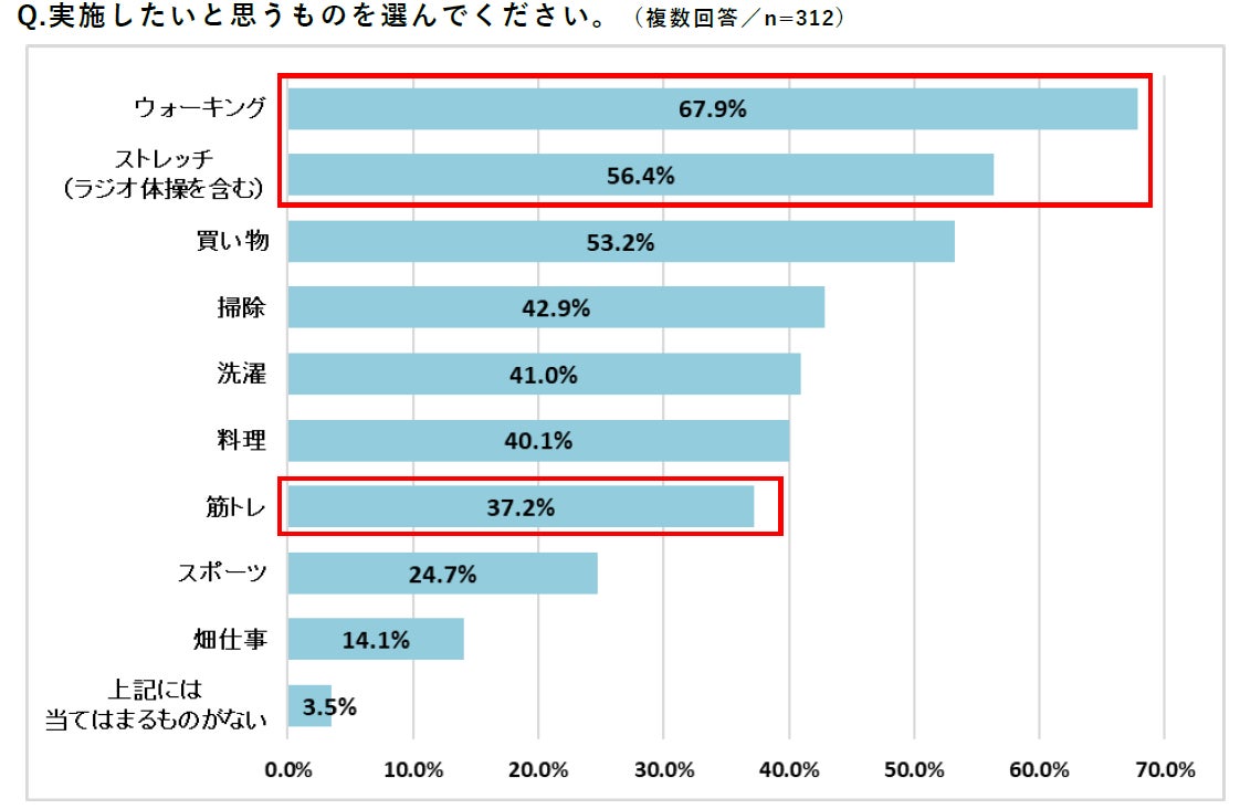 男女別でみると、男性は有酸素運動である「ウォーキング(53.8%)」を半数以上が行っており、「ストレッチ(25.6%)」も4人に1人が行っているのに対し、女性は4位まで家事が占めており、男女の家事分担の違いか、一般的に運動に分類される「ウォーキング」などは5位以下となっています。