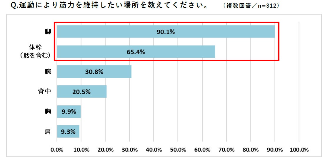また、現在の運動の有無にかかわらず、運動により筋力を維持したい場所を尋ねたところ「脚(90.1%)」、「体幹(65.4%)」が上位にランクインしました。日常生活を送る上で重要となる下半身の老化を防ぎたいと考えている方が多いことが分かります。