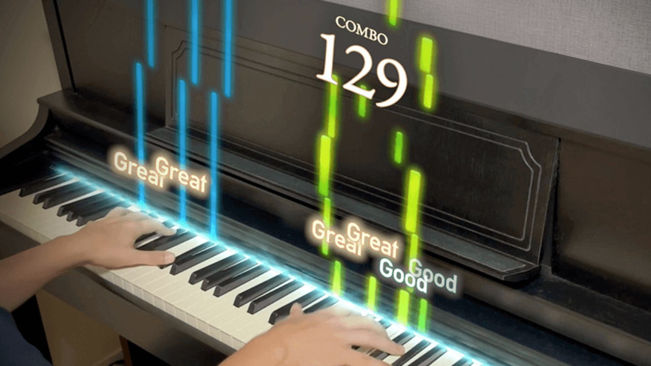 VRゴーグルを使用することで、ピアノ上にノーツ(音の棒)を表示し、ゲーム感覚でピアノを弾くことができます。