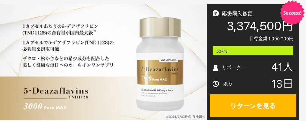 当社の商品「5-Deazaflavins 3000 Pure MAX 」は2024年7月23日にMakuakeにて販売開始し、開始50分で目標金額を達成、2時間で倍金額を突破と想定以上の反響をいただき、予定在庫がなくなってしまったことで、一時新規販売を止めておりました。