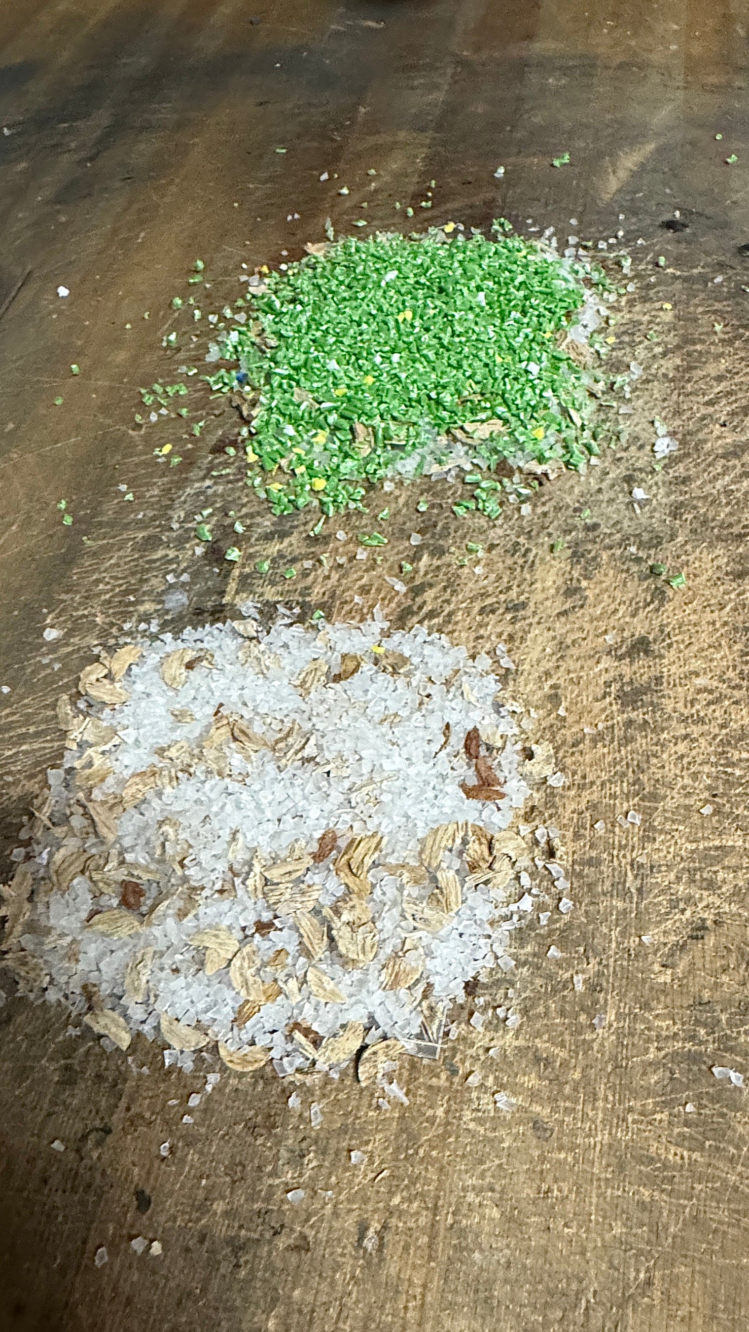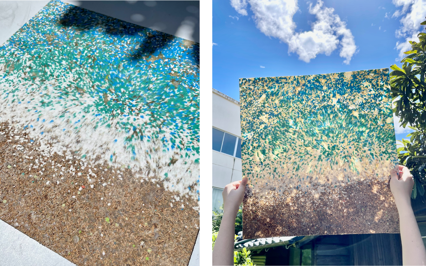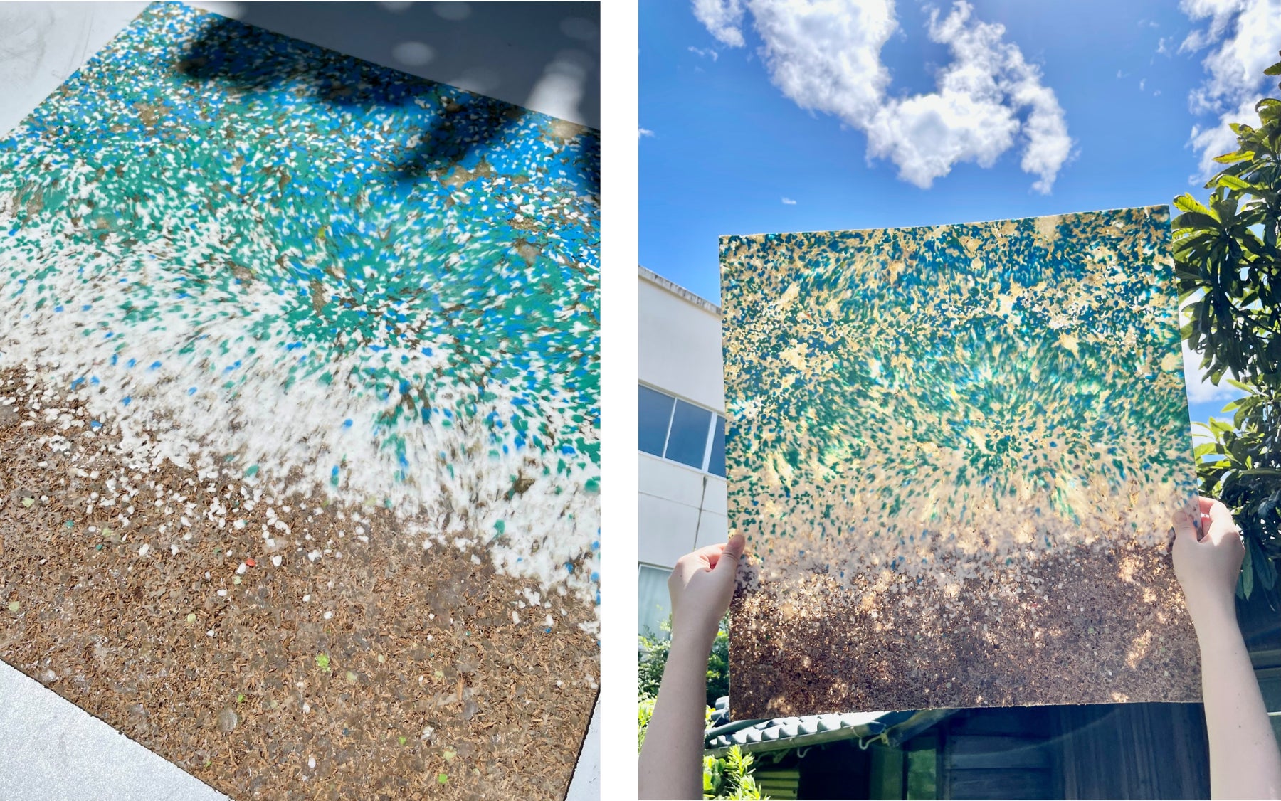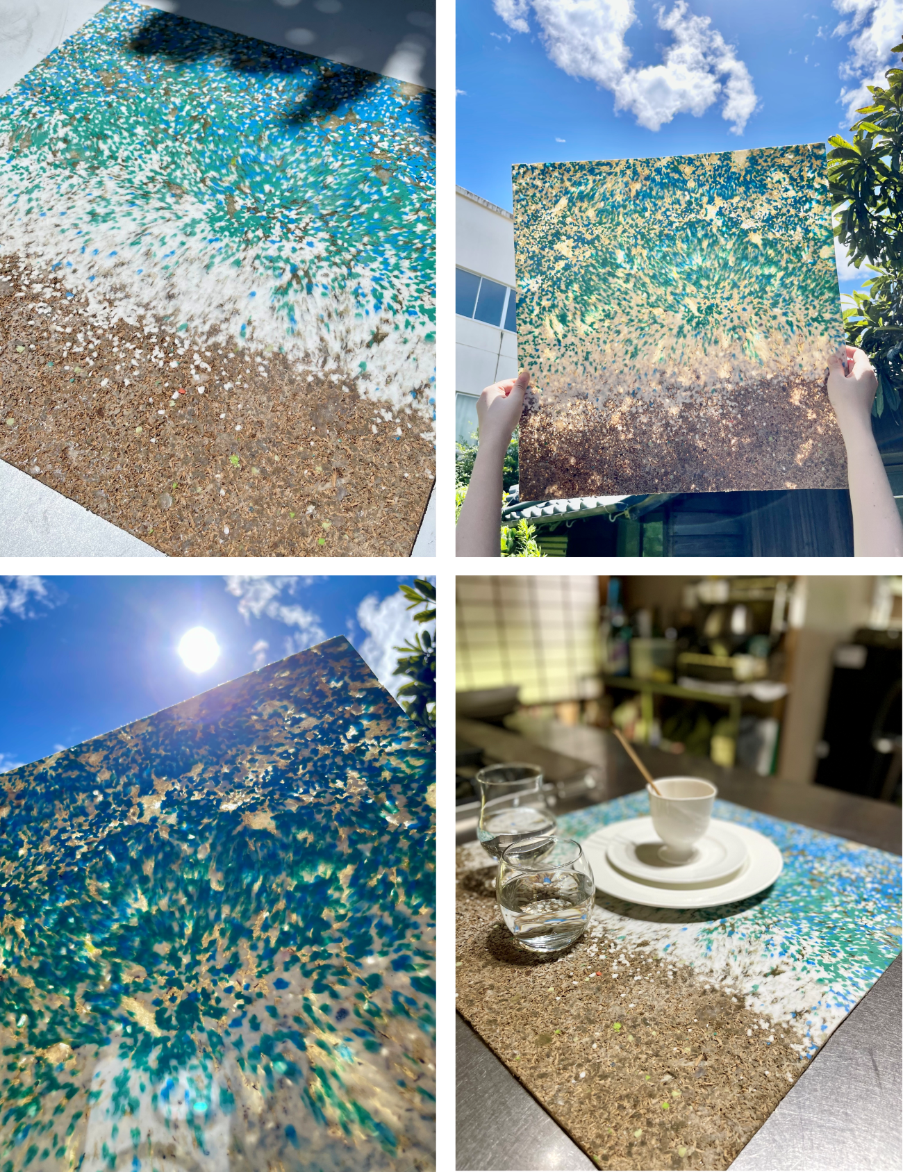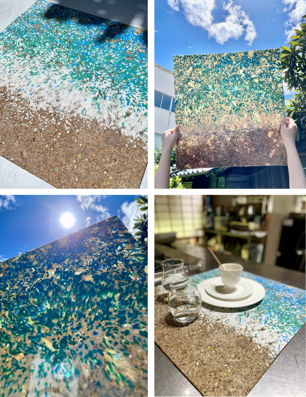 今回、制作するカウンターシートは、「廃プラスチック」と「おがくず」で作られています。使用している廃プラスチックはペットボトルキャップで約1,300個相当の量を活用。江ノ島エリアの海岸にあたる「片瀬西浜・鵠沼海水浴場」「片瀬東浜海水浴場」「腰越海水浴場」の砂浜に捨てられたキャップや、同店をご利用のお客様がお持ち込みいただいたキャップを含めて制作しました。また、おがくずを混在させることで、ドリンク類のグラスから滴る結露も吸収される仕様になっています。海のある街・藤沢に店舗を構えている同店として、いつの日か藤沢の海が、今回制作したカウンターシートのような海になって欲しいという願いを込めた色合いに仕立てています。