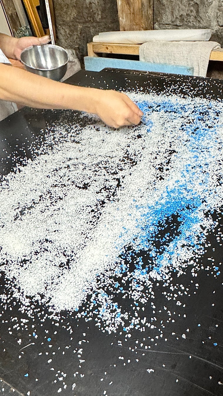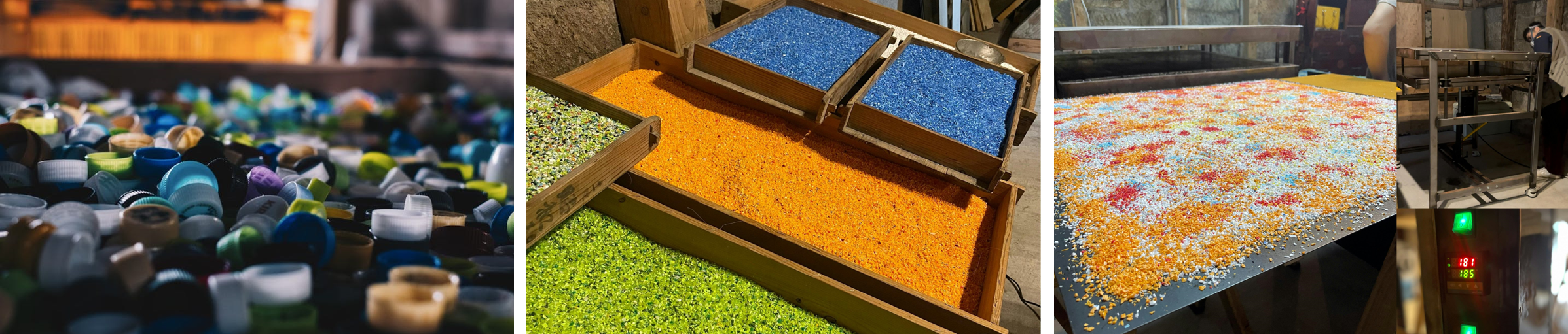 Repriseでは再生プラスチックを使って、材料と製品の両方を製作。その2つに至るまでの全ての工程は手作業で行います。回収したペットボトルキャップはそのまま製作には使用できないため、まずは綺麗に洗浄。洗浄したキャップは乾燥させたのち色ごとに分別し、それぞれ破砕したカラーチップを材料として使用します。また、成形作業もひとつひとつ手作業で行っているため、溶かしたプラスチックのプレス具合や、ヤスリの掛け方、バーナーでの炙り方で少しづつ表情の違う製品が出来上がります。