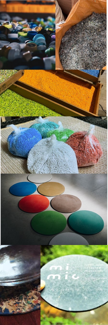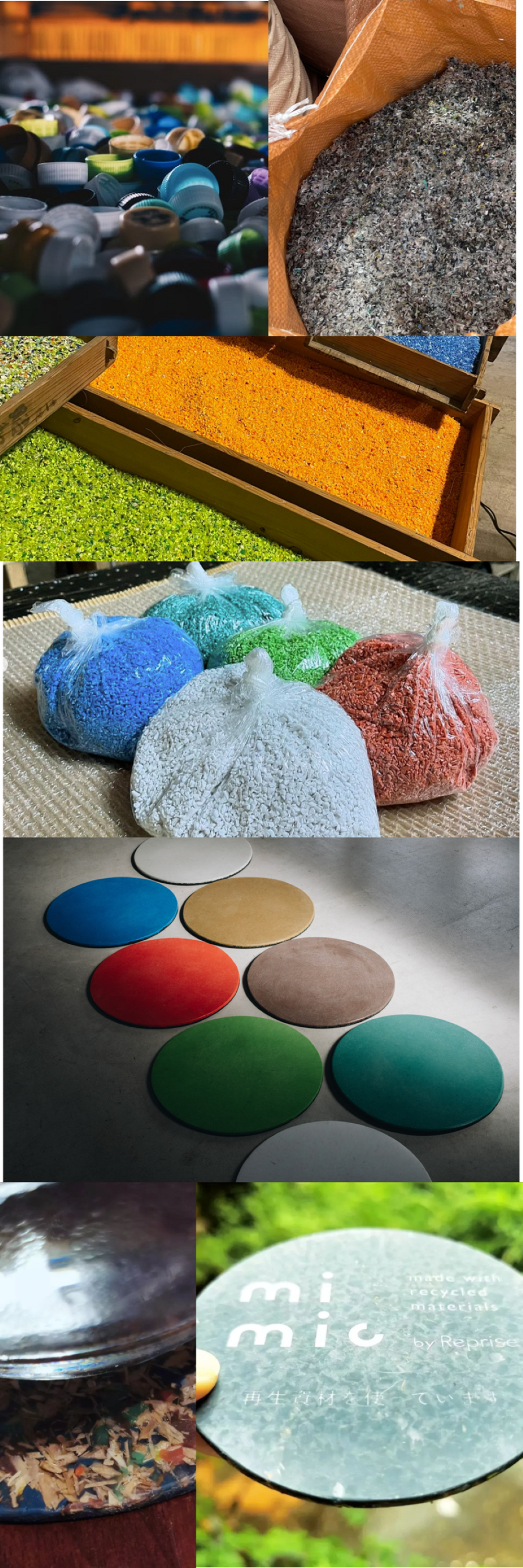 <原材料>Repriseでは原材料となるペットボトルキャップや残渣などを鹿児島県内各所から回収し再生プラスチックとして使用しております。