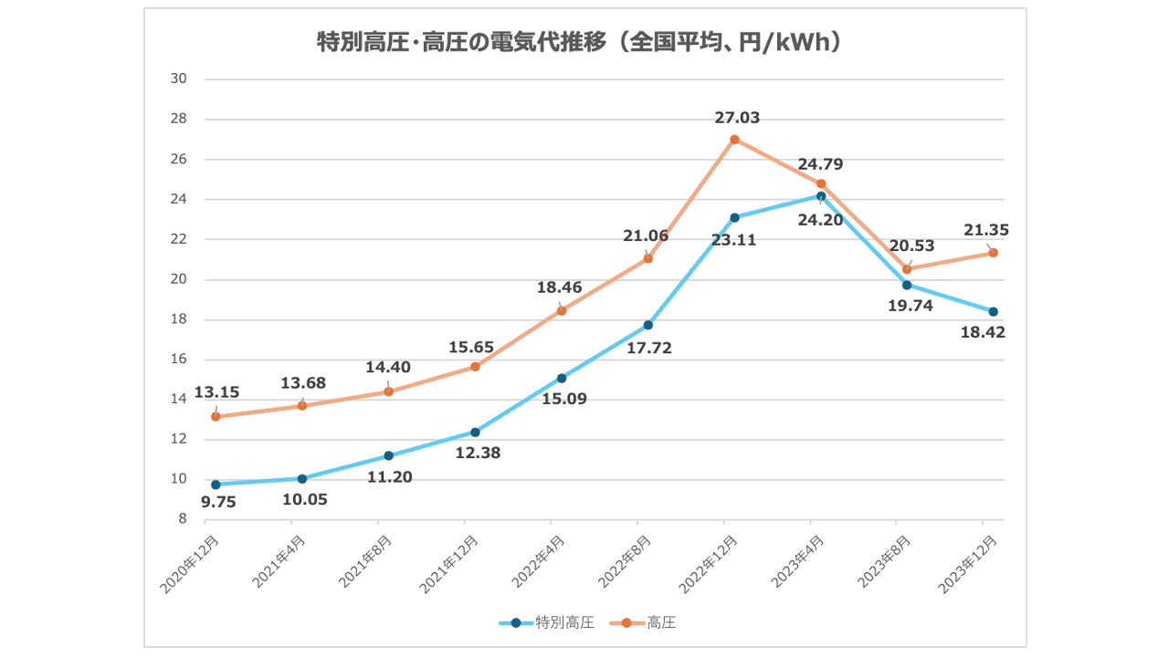 世界的なエネルギー事情の変化や円安の影響により、電力価格は大幅に高騰しており、2020年12月と2023年12月を比較すると高圧電力で約1.6倍、特別高圧で約1.8倍になっています。