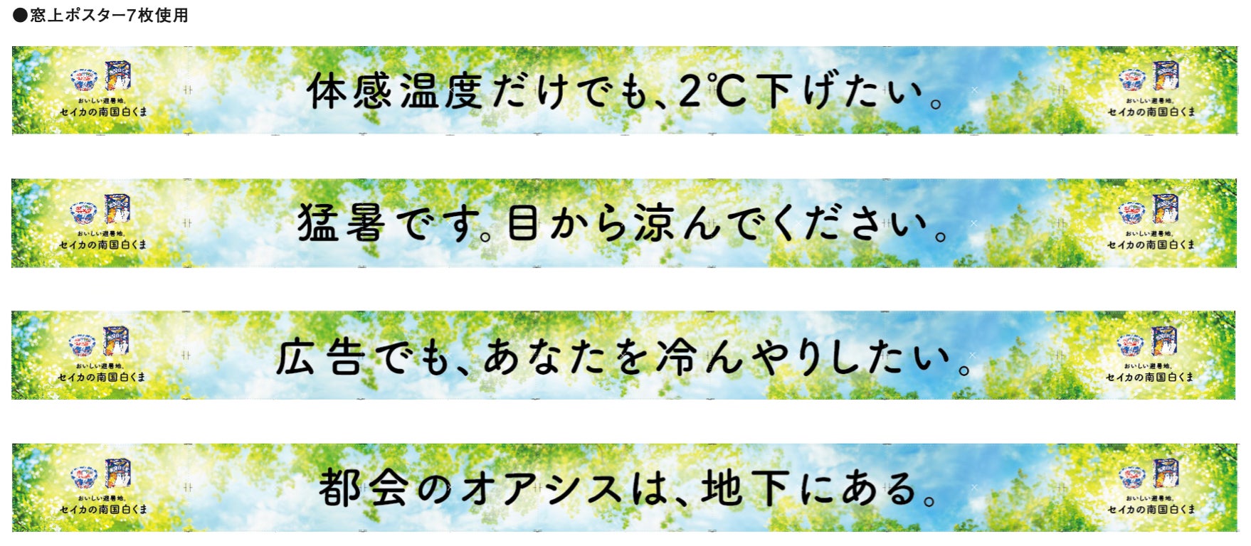 今回の企画は、そのCMをベースに「南国白くま」が食べたくなる暑いこの時期に、電車内も避暑地にしようという趣旨のもと誕生しました。福岡初※1 の床面シートを利用した南国白くまの世界観の電車広告を通じて、通勤・通学の皆様に暑い夏を乗り越えてもらえるよう企画しています。