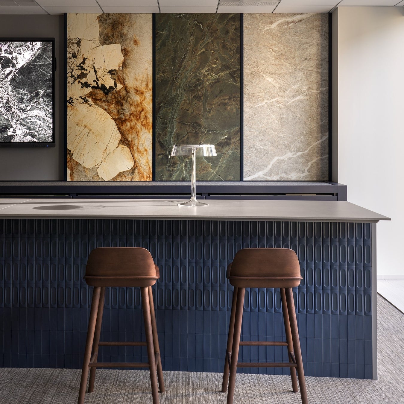 その正⾯の壁には今年のミラノサローネで発表した精緻で美しい⽯⽬調や⼤理⽯調の⼤判タイル、カウンター天板は 12 ミリ厚のソリッドなコンクリート調、カウンターの腰壁はハンドメイド調のタイルで彩りました。
