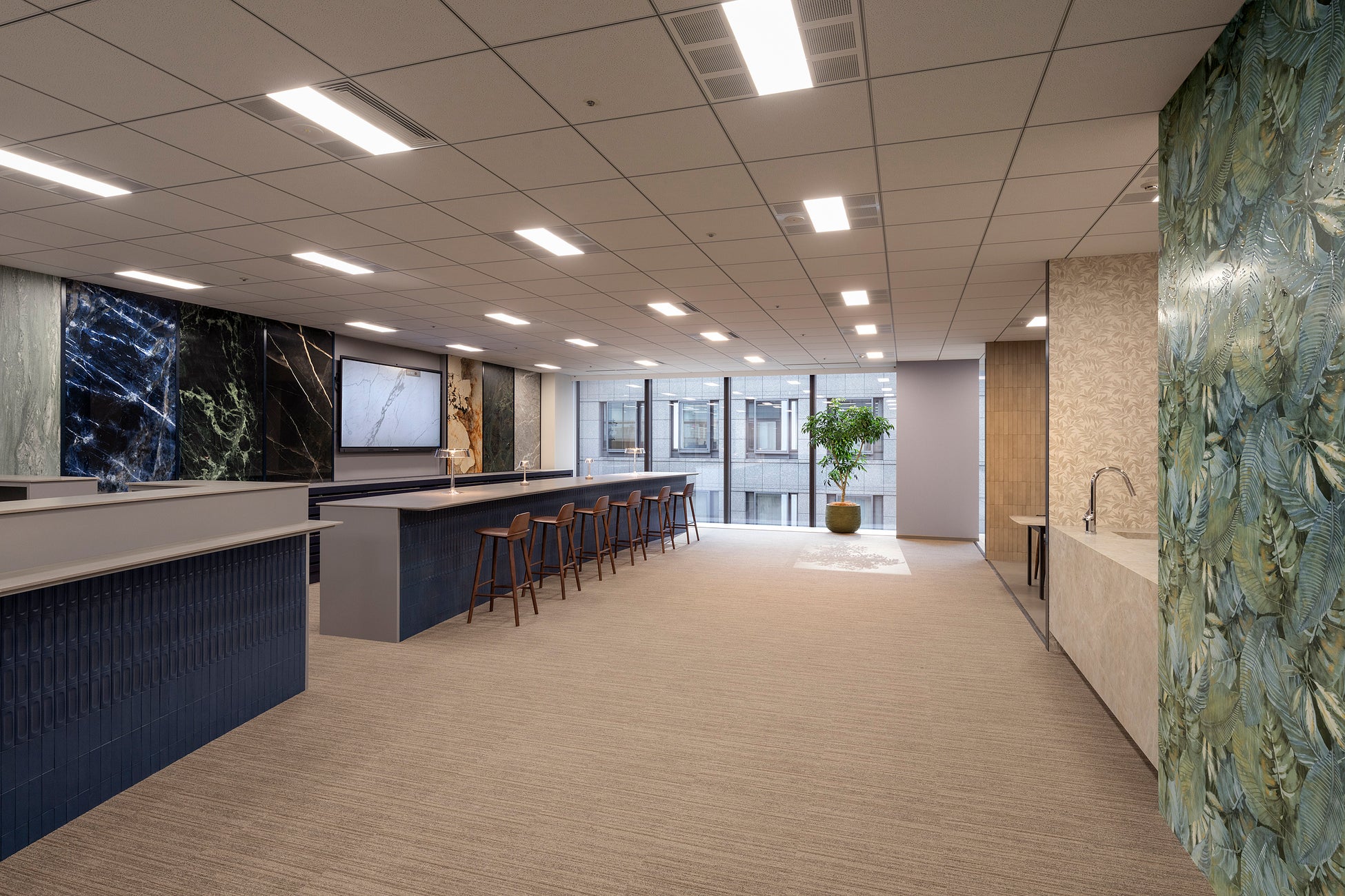 場所は、建材やインテリア関連の企業がオフィスやショールームを構えるビジネスの中⼼、本町エリアのビル 7 階です。コンセプトは“マラッツィ・カフェ”。バリスタがこだわりのコーヒーでもてなすように、 ⼼地よい空間で格別に美しいタイルをおすすめしたいという思いを、奥に向かってやさしい弧を描く 7 メートルものセラミックカウンターで表現しました。