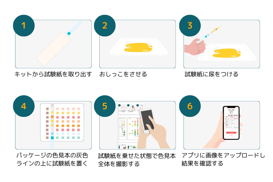 本キットでは、ペットの尿を試験紙に吸収させることで、尿中の成分に応じてパッチの色が変化します。この結果を基に健康状態を把握できるため、ペットの飼い主は自宅で愛犬・愛猫の体調不良を早期に察知し、早期対処を実現することが可能になります。