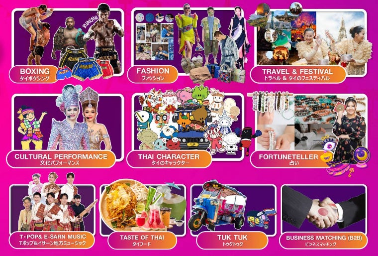 タイの伝統的なチェック柄の布“パーカオマー”で装飾された会場には、総勢100名を超えるタイのアーティストが来日。音楽、フード、トラベル、製品、ファッション、ムエタイ、占い、ボーイズラブドラマ作品など、タイの文化を多方面から日本に紹介する盛り沢山のアクティビティを実施します。会場内のステージでは、参加するタイ好きの日本アーティストとともにタイと日本の音楽コラボレーションも披露いたします。