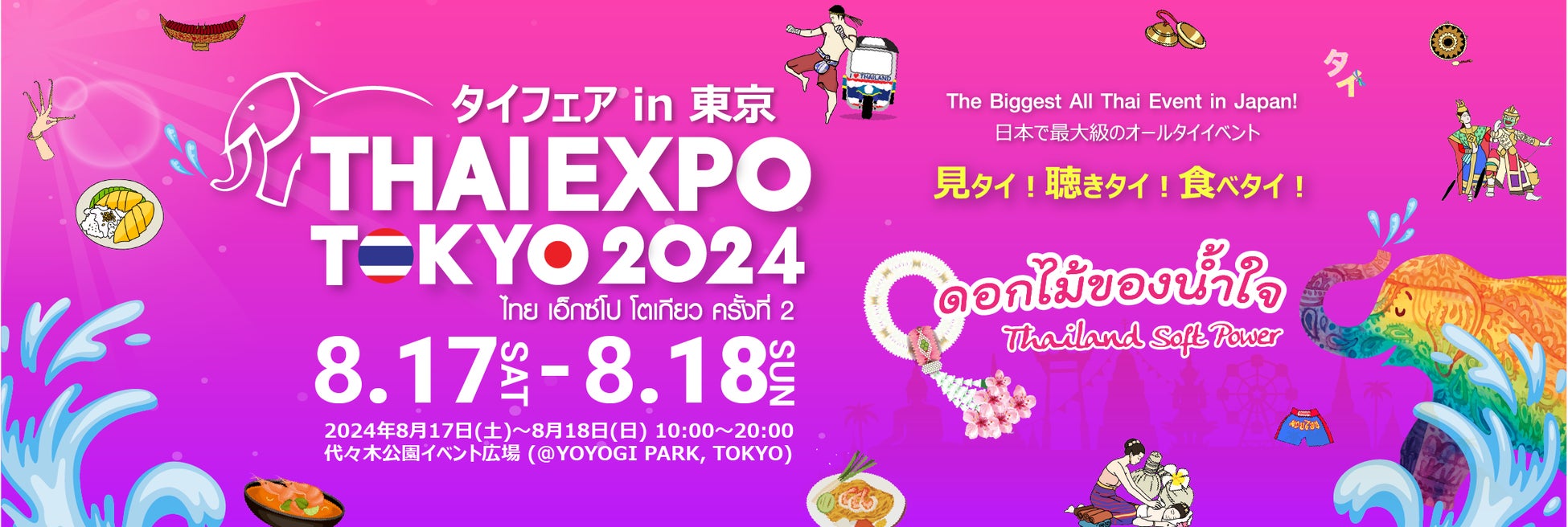 タイの文化を全身で楽しめる日本最大級のオール“タイ”イベント「タイフェアin東京~THAI EXPO TOKYO 2024(タイエキスポ)」を、東京渋谷区の代々木公園にて2024年8月17日(土)18日(日)2日間開催いたします。