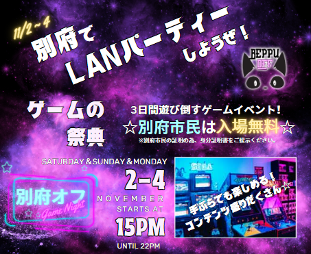 ゲームイベント企画をしているJust4Design(代表:門脇祐二)は、別府市制100周年記念として、2024年11月2日(土)・3日(日)・4日(月)の3日間でLANパーティーイベントを開催します。