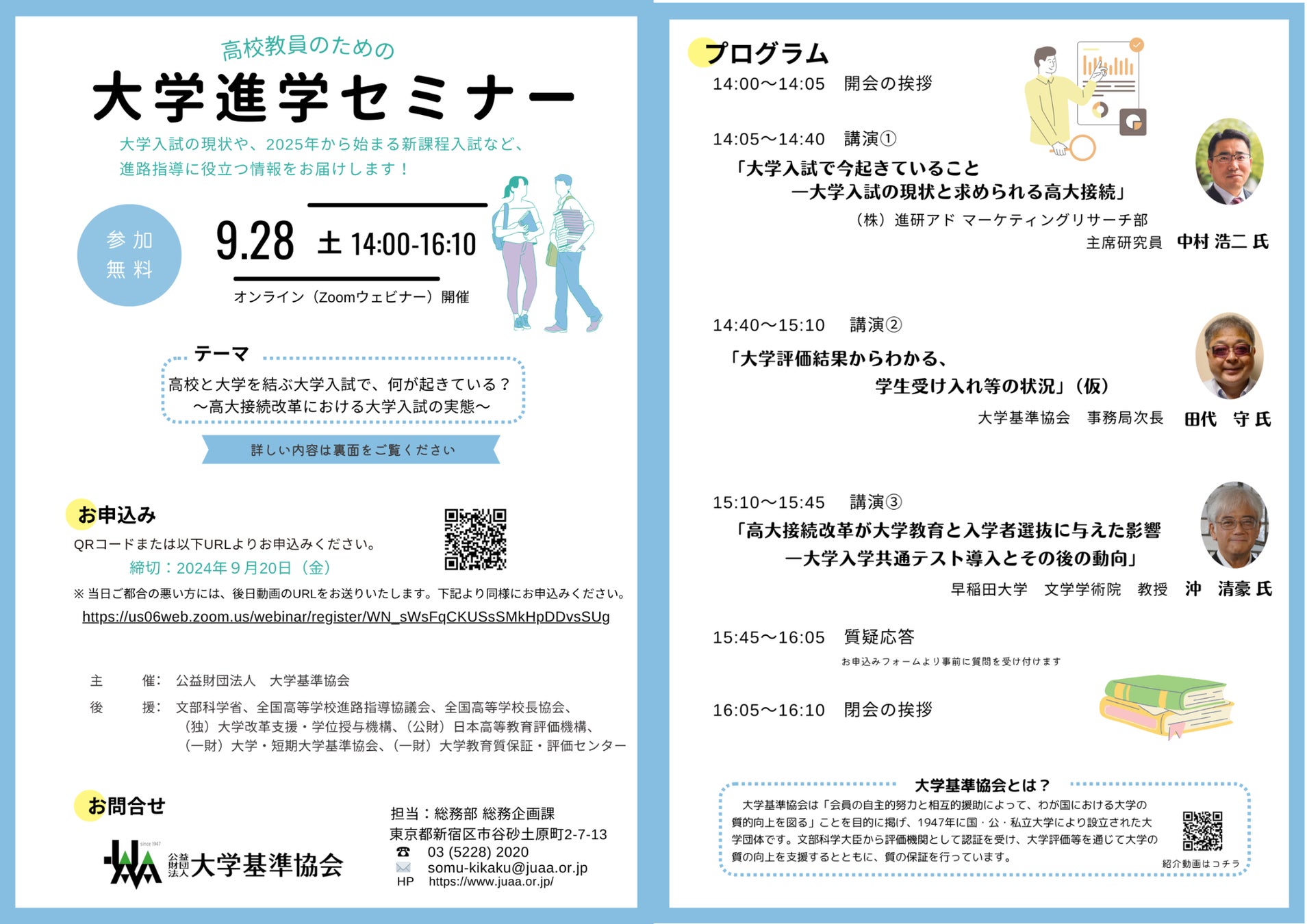 公益財団法人大学基準協会(所在地:東京都新宿区、会長:髙橋 裕子)は、2024年9月28日(土)に、「大学進学セミナー」を開催いたします(オンライン・Zoomウェビナー形式)。講演者として(株)進研アド マーケティングリサーチ部主席研究員の中村浩二氏、本協会事務局次長の田代守氏、早稲田大学文学学術院教授の沖清豪氏を迎え、高大接続の観点から大学入試の実態に迫るとともに、認証評価結果を用いた情報収集、高大接続改革による入試の変化等についてお話いただきます。