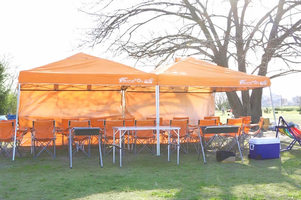 場所取り+設置+火起こし+片付け込みまで含まれたタープテント付き機材セットがお一人様1,600円(税込1,760円)からご利用いただけます。