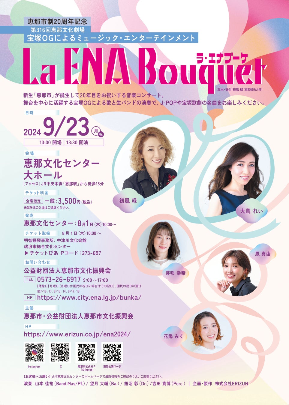 9月23日(月・祝)岐阜県恵那市の恵那文化センター大ホールにて、恵那市制20周年記念 第316回恵那文化劇場 宝塚OGによるミュージック・エンターテインメント『La ENA Bouquet』の開催決定
