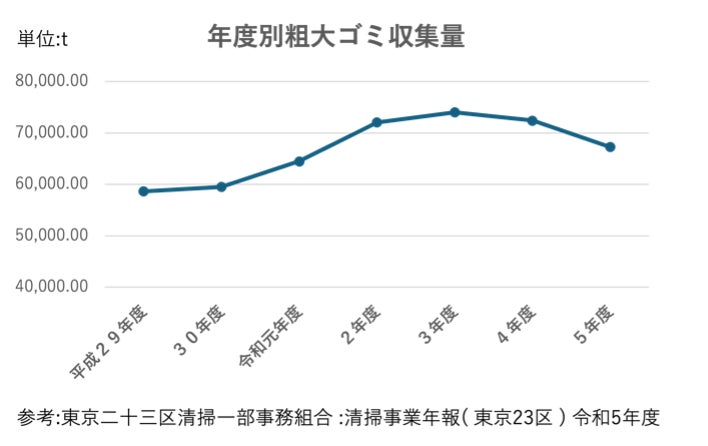 東京23区の粗大ゴミの発生量は近年増加傾向にあります。東京都のごみ埋立地は東京湾しかなく、埋め立てができる量に限りがあります。埋立処分場の残余年数を少しでも延ばすためにも、ごみ減量に向けた取組は重要な課題となっています。そんな中、各自治体では粗大ゴミの処分を有料化することで、「家庭ごみの削減」、「焼却場や処分場、清掃工場の負担を減らすことでの延命化」に取り組んでいます。