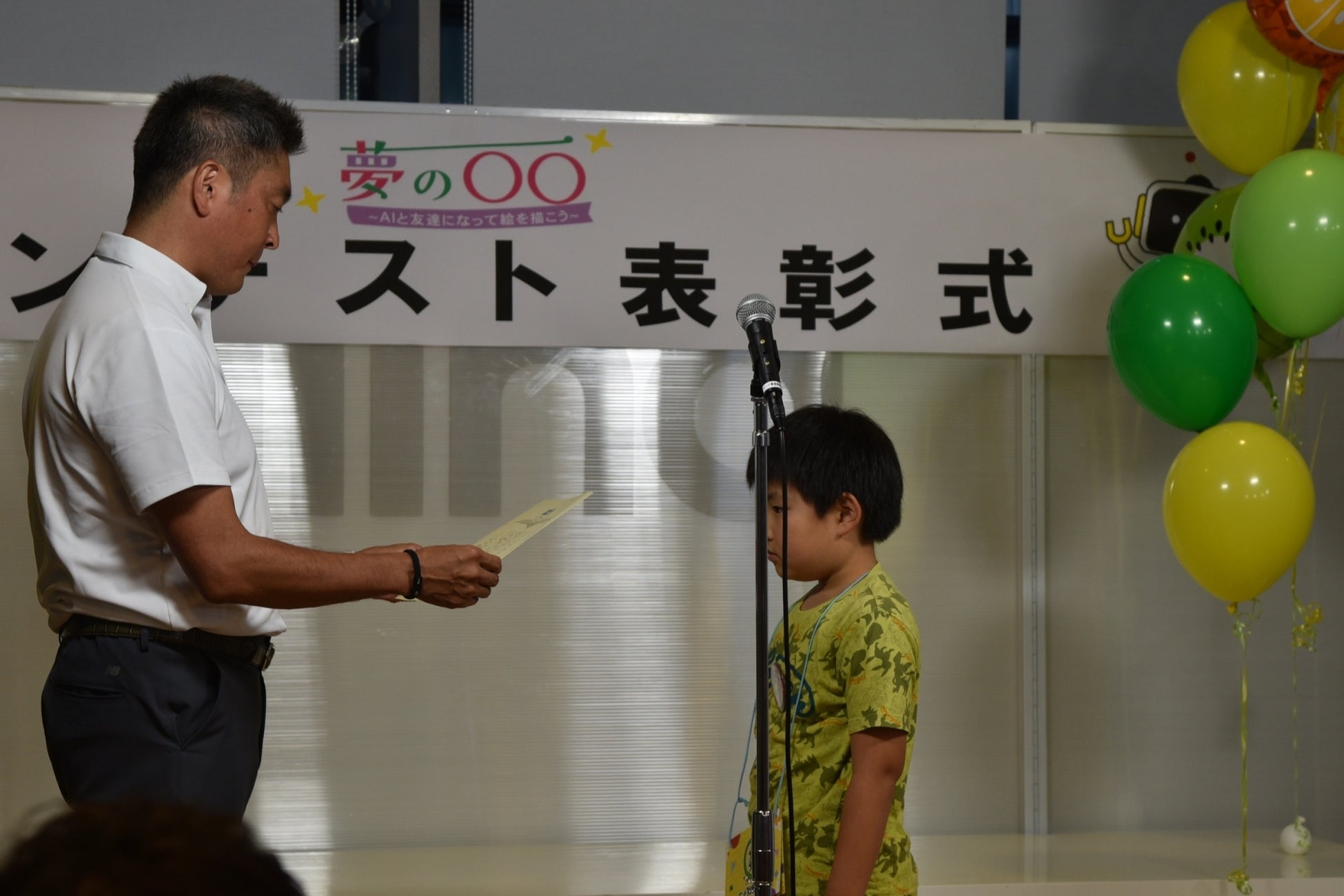 生成AIを利用した小学生のコンテスト事例はほとんどなく、当会議所としても新たな試みです。当事業の冠スポンサーである、トヨタL&F岩手賞は盛岡市の佐藤智彬さんが受賞し、その作品に取り組んだ際のポイントなどが発表されました。