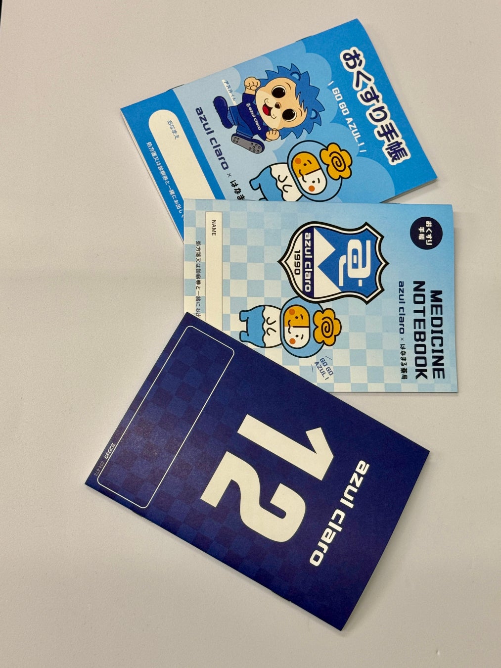 デザインは2種類ご用意しております。一つはチームエンブレムとはなまる薬局のキャラクター「はなまるっち」のデザイン、もう一つはアスルクラロ沼津のマスコット「アスルくん」と「はなまるっち」のコラボデザインです。さらに、お薬手帳の裏面にはサポーターズナンバーである「12」のデザインが施されています。
