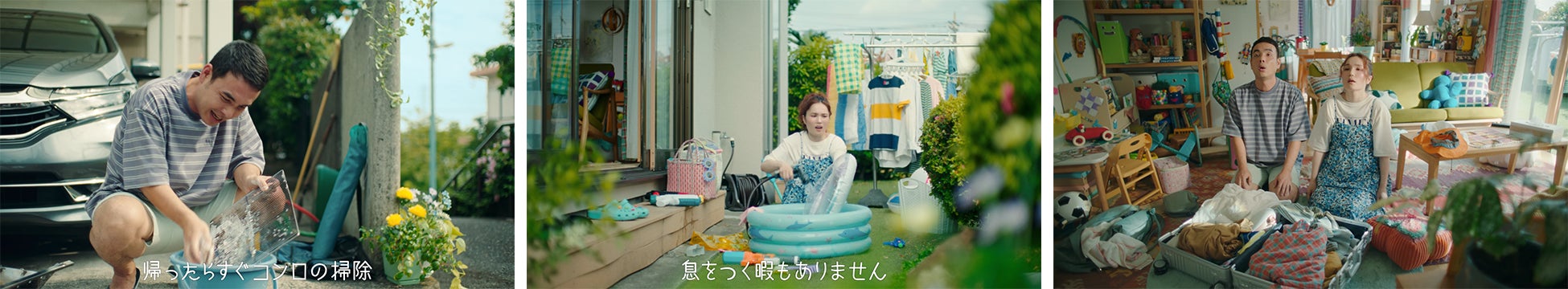 夏休みを遊び尽くした家族のシーンでCMは終わりと思いきや、そこには散らかった部屋に帰宅し、呆然と立ち尽くす夫婦の姿が。遊んでばかりいられないのが、大人たちの夏休み...と現実を突きつけられます。