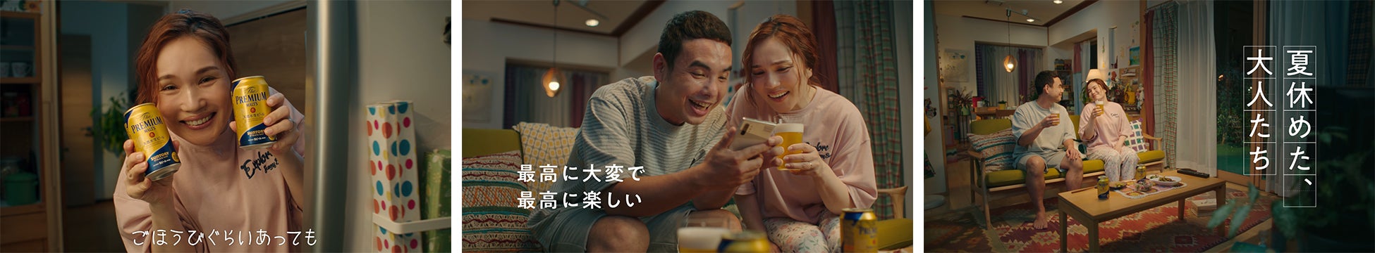 夏休みに入ると、海水浴にキャンプ、旅行など楽しいイベントが目白押しで遊んでばかりの楽しい毎日が過ごせる...という訳にはいかず、帰宅後の片付けや日々の家事、そして子どもたちのお世話と、いつもよりも大変なママ・パパたちの姿を描きます。「夏休みは実は疲れやすい、ストレスが溜まりやすい」といった意見もネット上で話題になるなど、楽しいだけではない、悩みや苦労が増える大人の夏休み。そんな大変ながらも楽しい夏休みのイベントを終えた後には、「いい日、プレモル。」というコピーとともに、「ザ・プレミアム・ モルツ」を飲みながらお互いを労い、楽しい思い出を振り返りながら、幸せを噛み締めるママ・パパの姿を描いたCMとなっています。