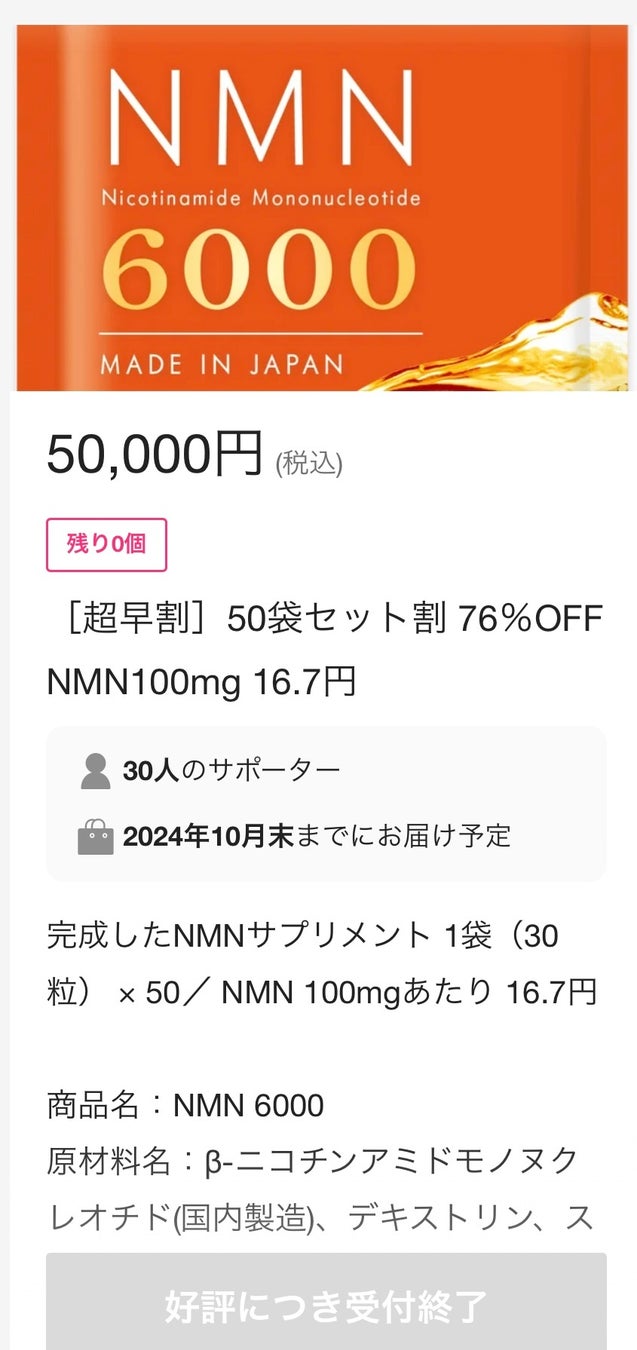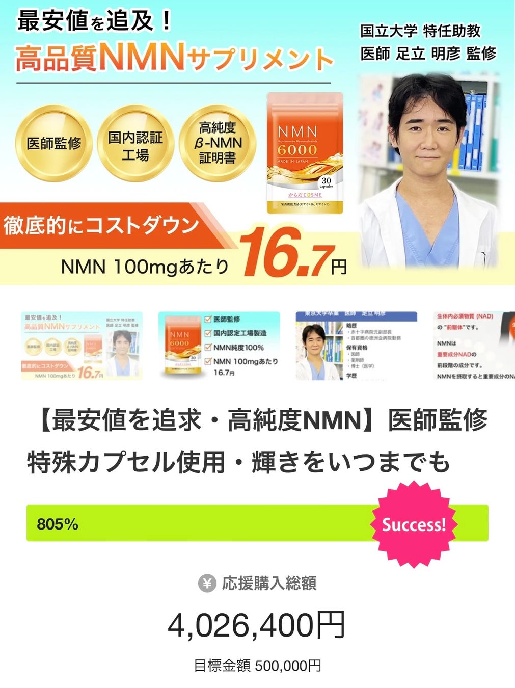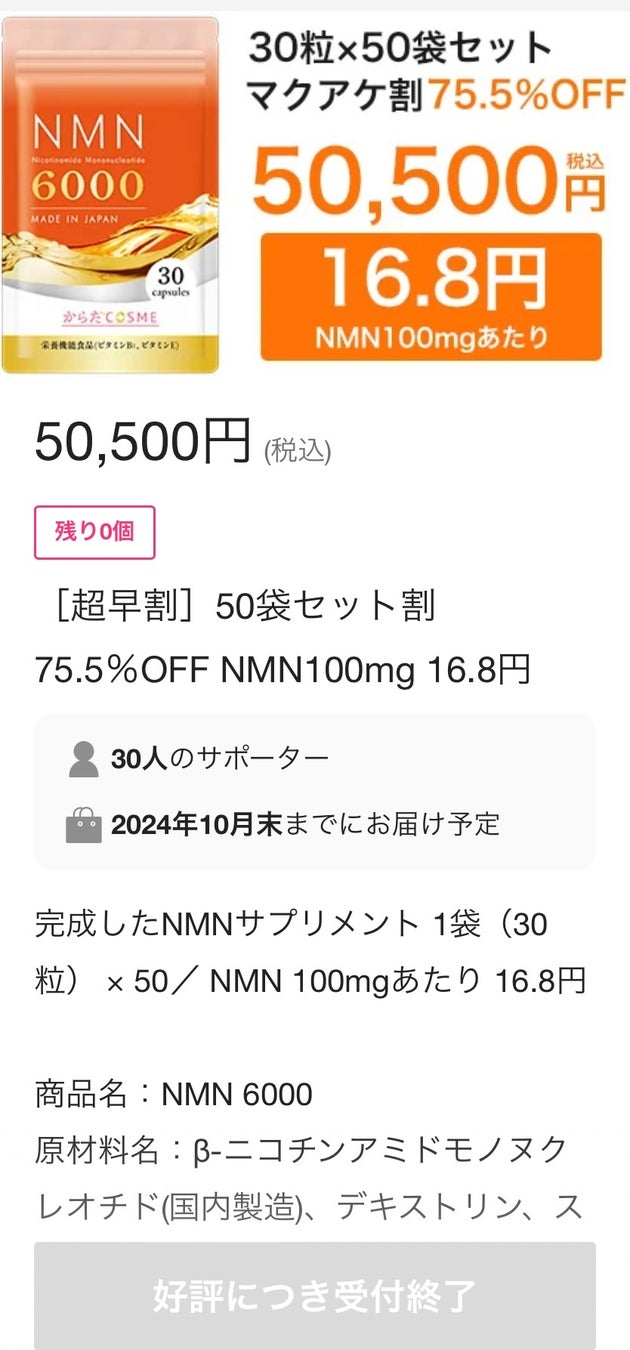 高品質、最安値NMNサプリメント「NMN6000」がクラウドファンディング目標金額800%を達成、購入金額が400万円を突破!若々しさのための新ブランド「からだCOSME」から追加リターンのお知らせ。