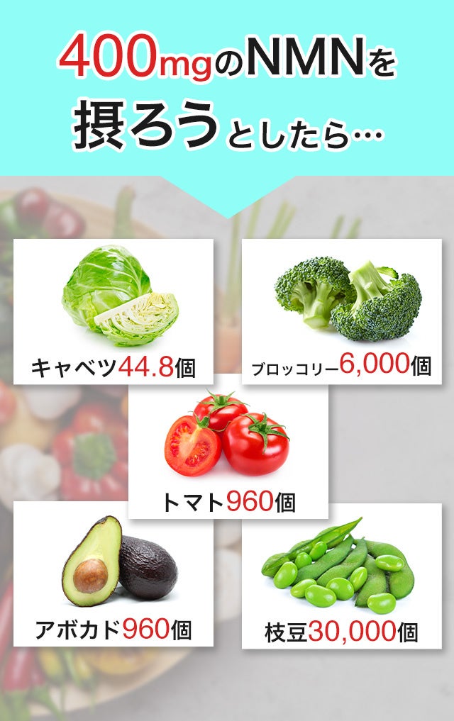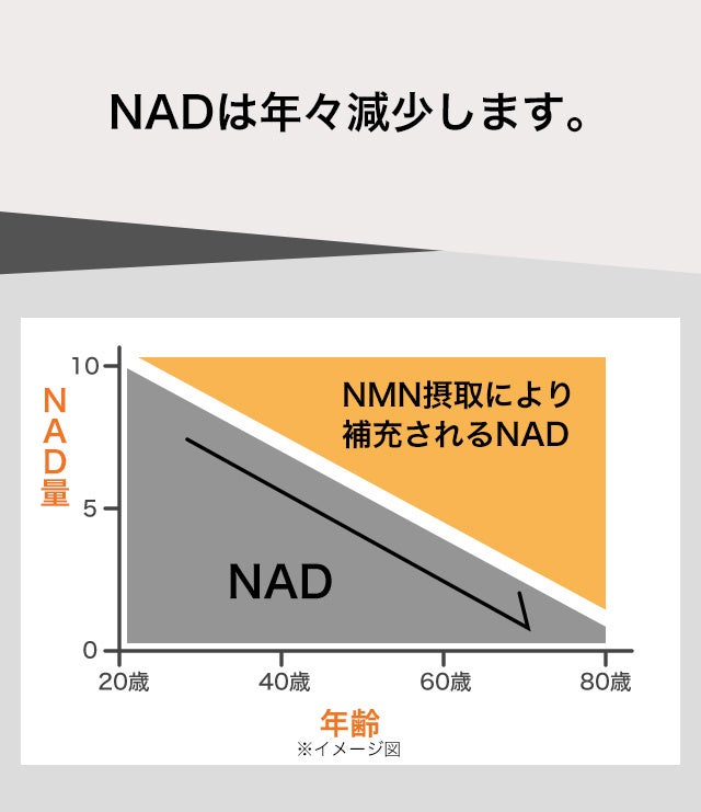 しかし残念ながら体内のNAD量は年齢とともに減少するため、NMNを補充することが重要になります。NMNを摂取することで、NADを増加させることが期待できます。