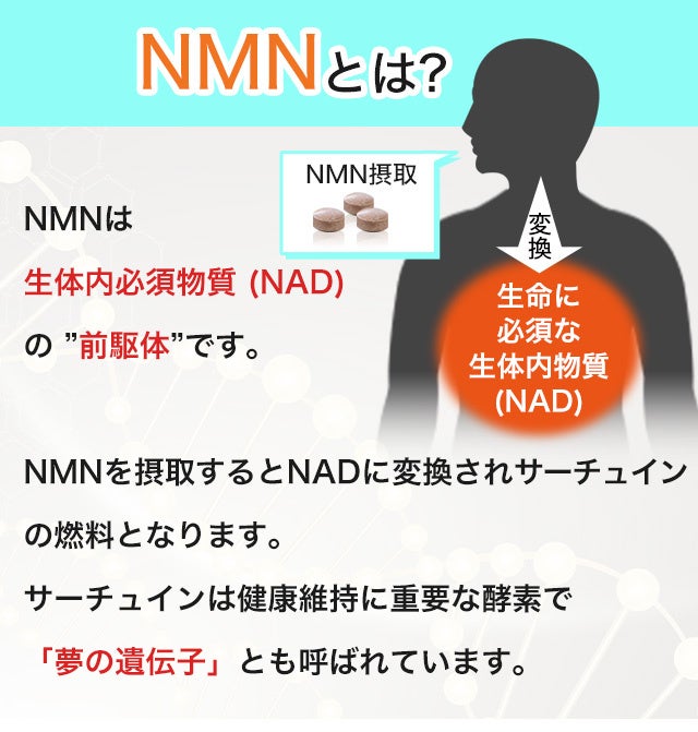 NMN(ニコチンアミドモノヌクレオチド)は、近年注目されている成分で、体内でNAD(ニコチンアミドアデニンジヌクレオチド)に変換されます。NADは若々しさを保つための遺伝子、サーチュインが働くための燃料になります。