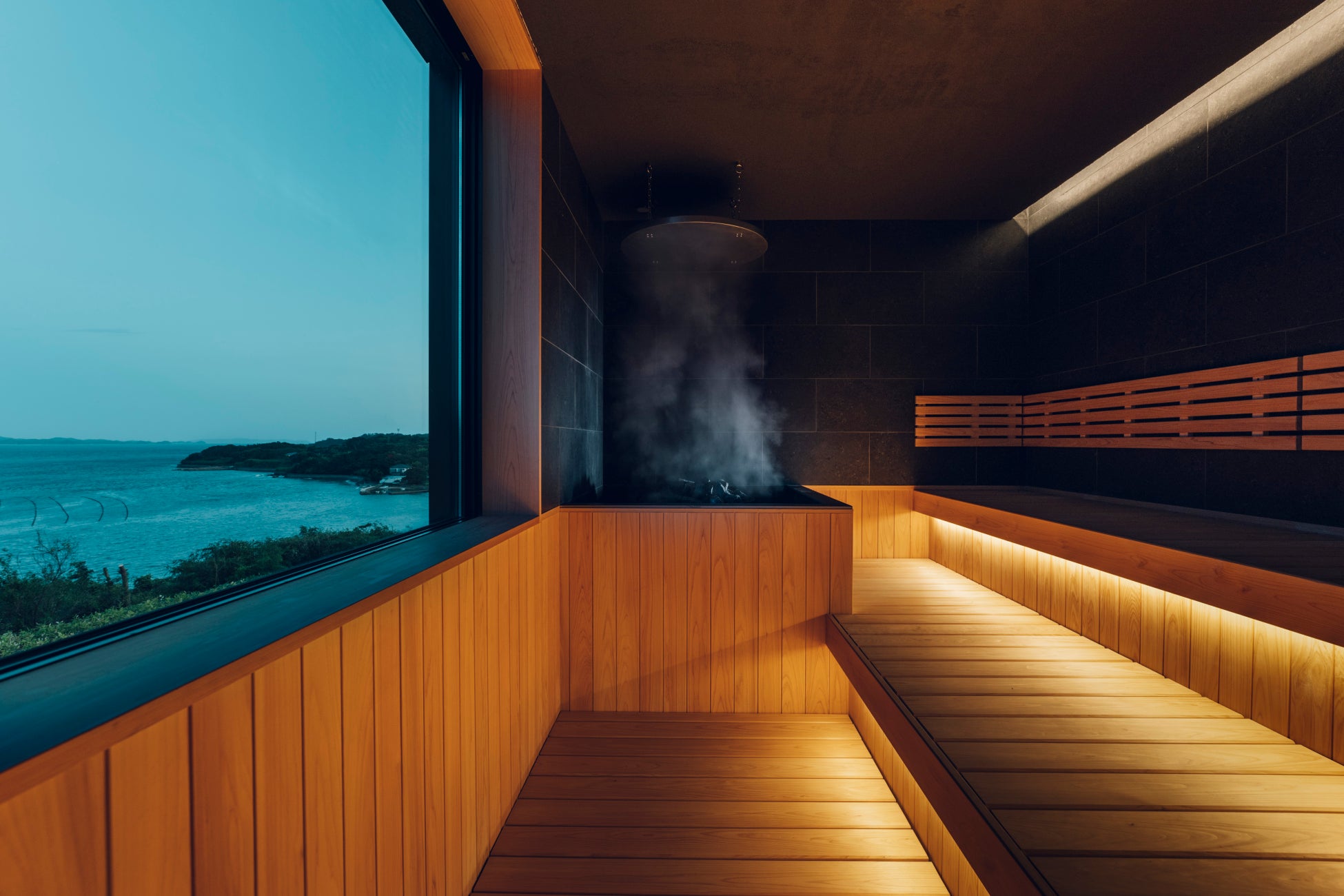 宿泊者限定。予約制でご利用いただけるプライベートサウナからは海景を眺めることができます。野外に水風呂とウッドデッキテラスを設え、広がる海と一体となるような開放感があります。