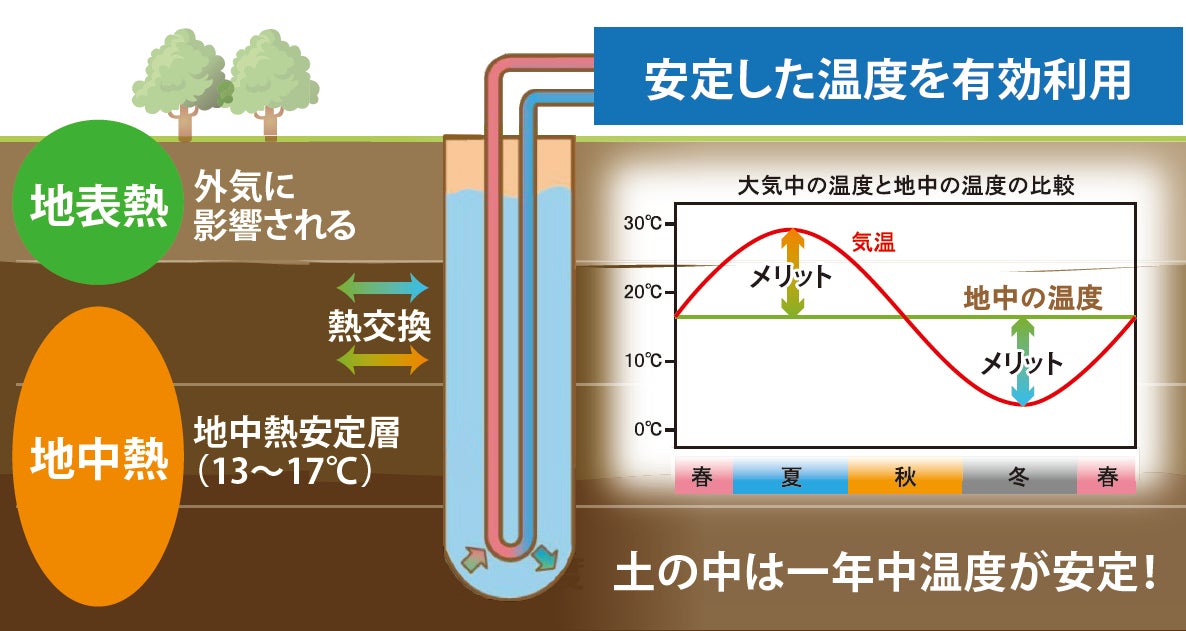 地中熱エネルギーとは、大気の温度変化の影響を受けない地下10~200mの地中の温度帯を活用した再生可能エネルギーの一種です。地中の温度は13~17℃と一定であるため、ヒートポンプの仕組みで、暑い季節には屋内の熱を地中に運んで排熱し、寒い季節には地中の温熱を屋内に運ぶことで冷暖房に活用することができます。すでにスポーツ関連施設や一般住宅、医療施設、施設園芸ハウスなど様々な分野で導入されています。