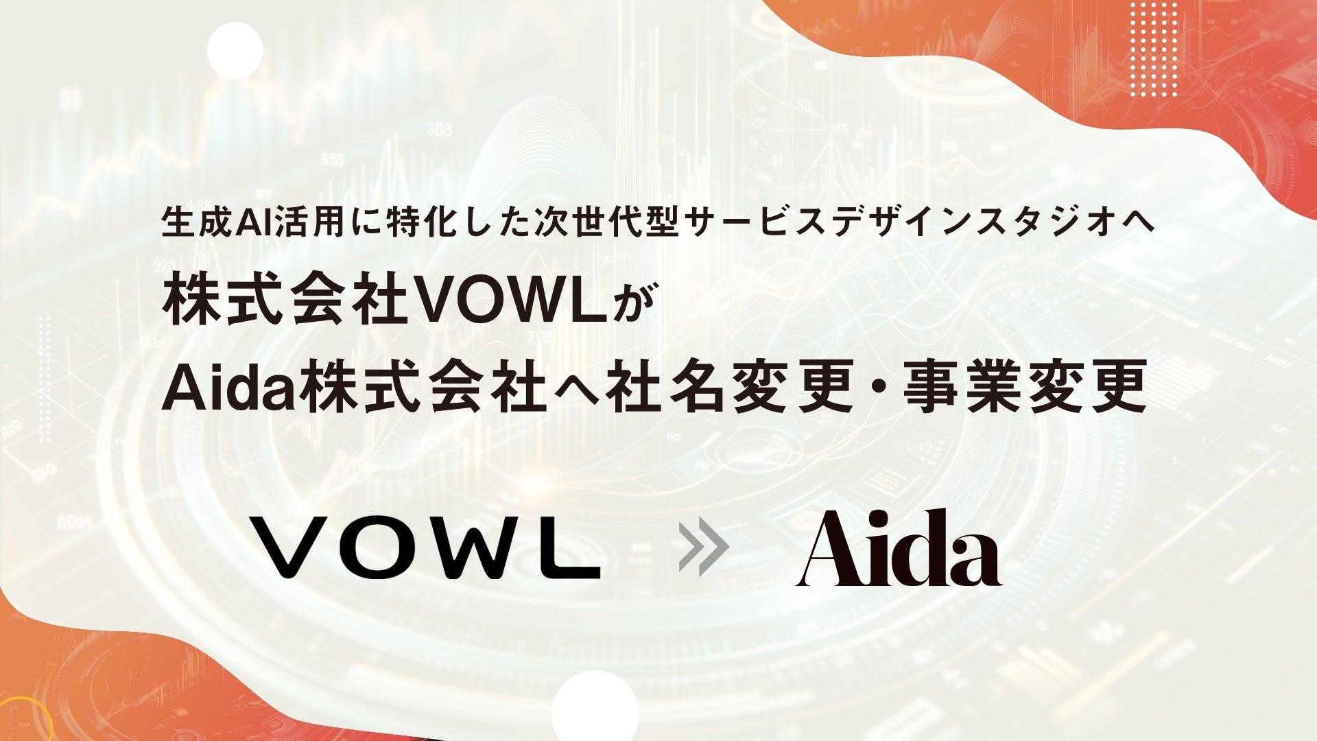 株式会社VOWLは事業ドメインの変更と共に社名変更を決定。AIを活用した高速かつ高品質なアウトプットを実現し、クライアントのビジネス成長を支援する「Aida株式会社」として生まれ変わります。